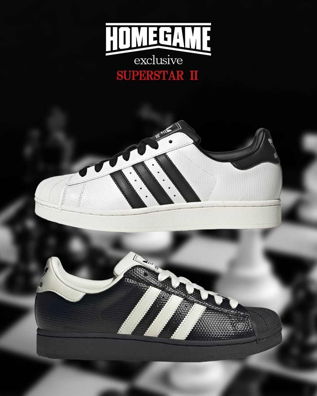 同モデルは、定番スニーカー「SUPERSTAR」の系譜を引く「SUPERSTAR Ⅱ」をベースにしたHOMEGAME限定(HOMEGAME店舗およびadidas直営店で展開)のモノトーン配色です。ブラック×ホワイトのミニマルな見た目で、ストリートから日常使いまでの需要を狙います。