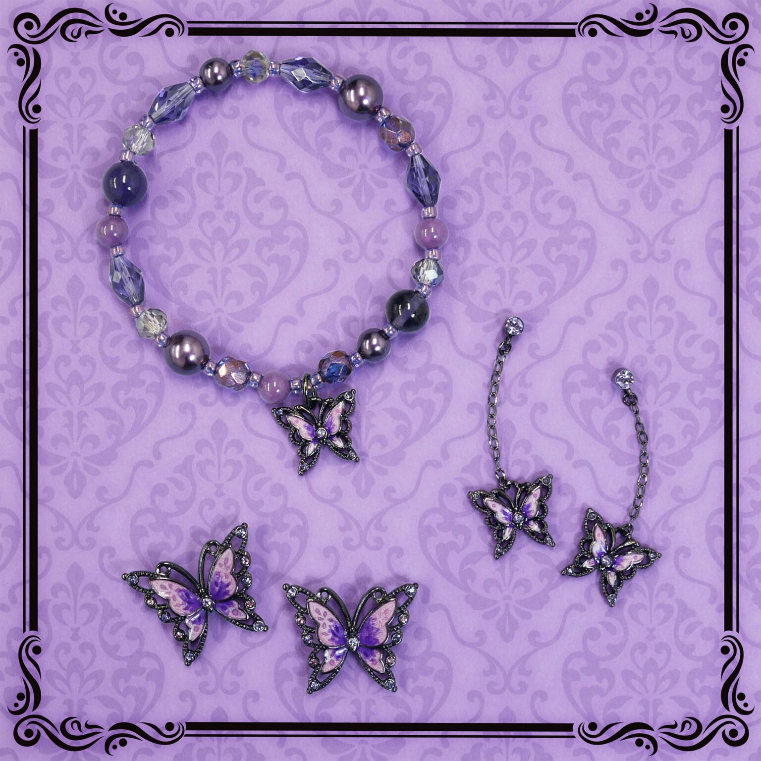 新作は、軽やかな透かし模様にパープルグラデーションを重ねた蝶モチーフを軸に、ブラック×パープルの配色でシックさとドラマティックさを狙ったデザインです。イヤーアイテムは揺れ感を強調し、ブレスレットはカットガラスのきらめきで存在感を出しています。
