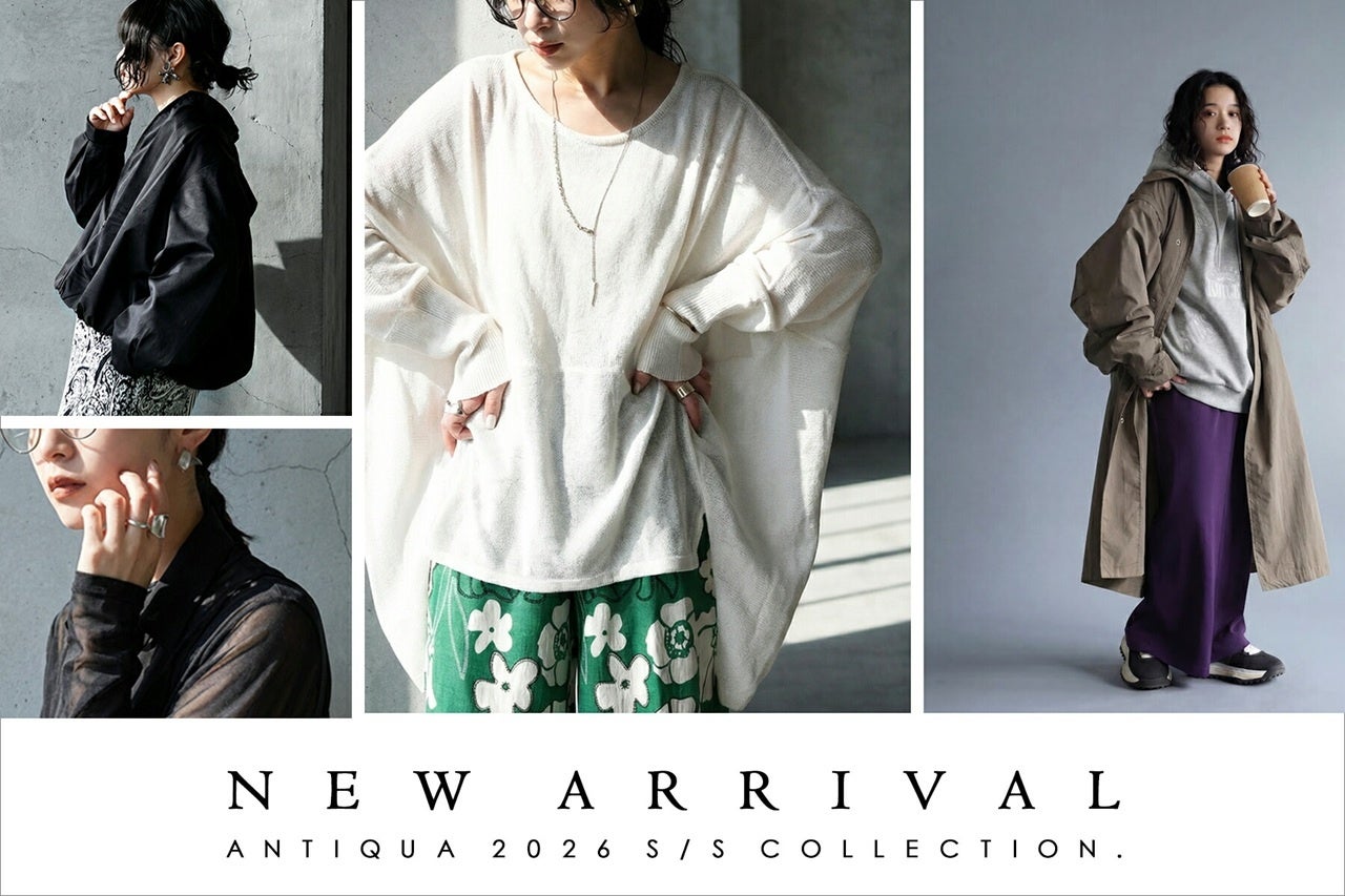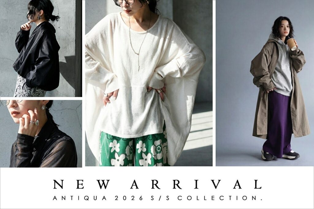 大阪府和泉市を拠点とするファッションブランド「antiqua」は2026年1月29日19時30分、2026年春夏の新作アイテムを公式オンラインストアで公開し、春の新作ラインナップを案内しました。商品番号PN-00595の変形ニットトップス、PKS-00001のタックブルゾンなどを掲載しています。