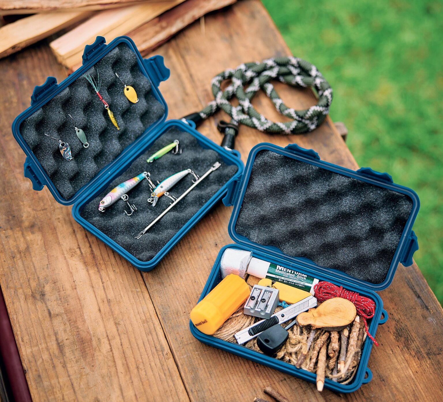 ケース内部は両面クッション、片面クッション、クッションなしの3パターンに調整でき、火起こしセットや釣り具など、サイズの異なる道具を入れ替えて使える設計です。防水仕様ではない一方、4か所の留め具でしっかりロックし、2か所のホールに手持ちのストラップを通せば肩掛けにも対応します。付録は紙版のみで、電子版には付属しません。