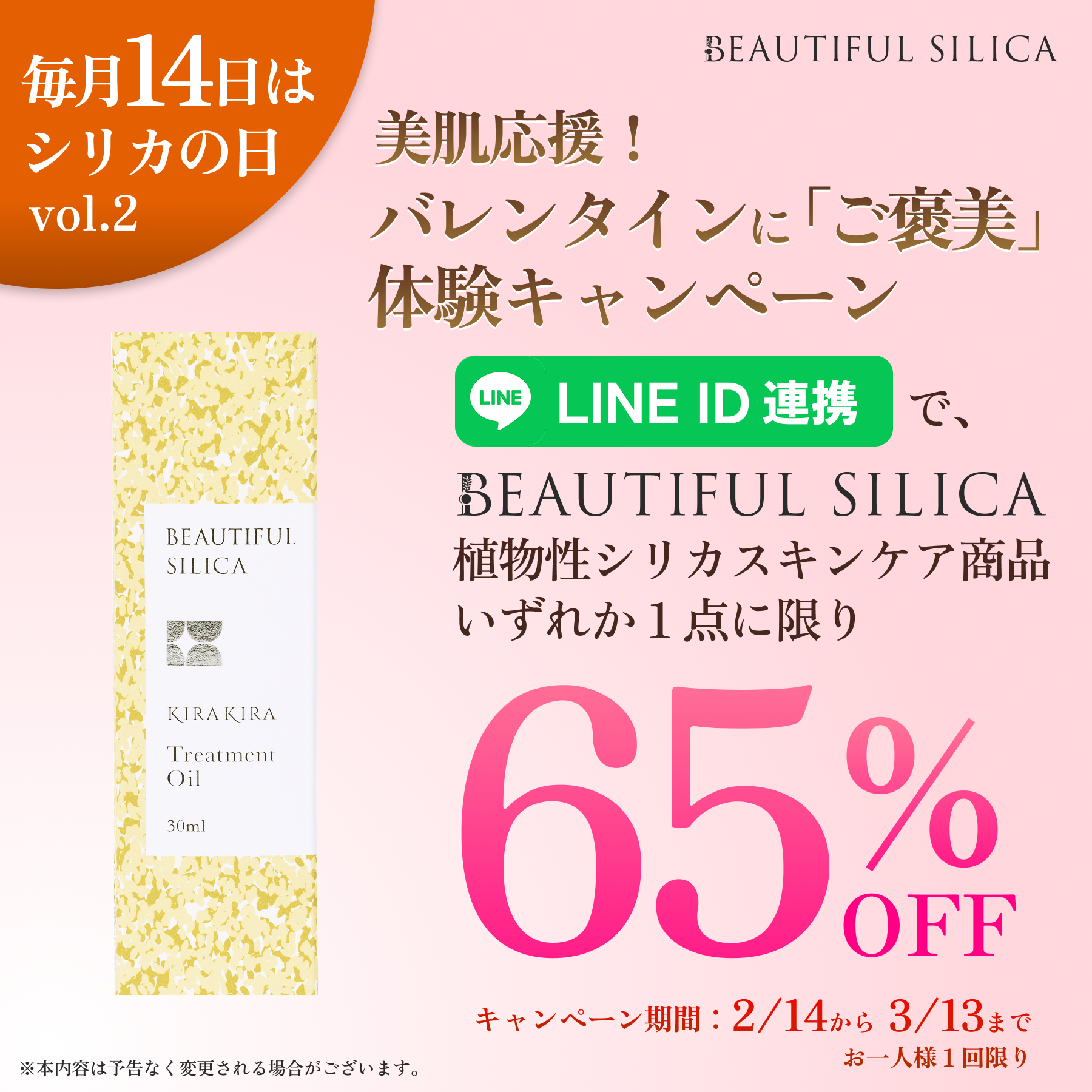 F.I.S.(東京都渋谷区)の植物性シリカブランド「BEAUTIFUL SILICA」は、スキンケアシリーズ「KIRAKIRA」全4商品を定価から65%OFFで購入できるキャンペーンを、2026年2月14日〜3月13日に公式オンラインショップで実施します。対象は公式LINEとID連携した購入者で、割引は1人1回限りです。