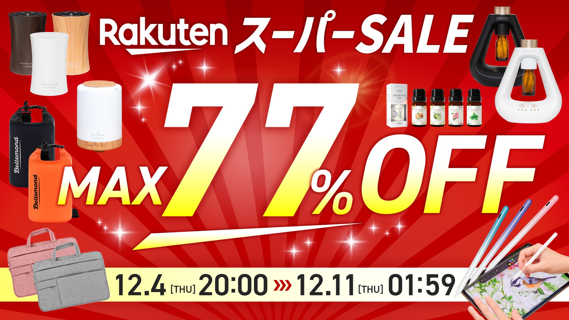 アロマブランド「BELLEMOND」は、楽天市場で開催中の「楽天スーパーSALE」に参加し、12月4日(木)20時から12月11日(木)1時59分まで、対象商品を最大77%OFFで販売します。水を使わないネブライザー式アロマディフューザーや卓上加湿器代わりにも使える超音波式ディフューザー、天然由来100%のエッセンシャルオイルなど、人気モデルが値下げ対象です。