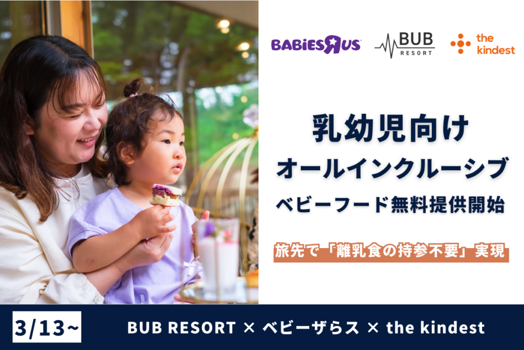 BUB(東京都品川区)は2026年3月13日、BUB RESORT Tsukuba(茨城県つくば市)で、0~1歳の子ども連れ利用者に国産ベビーフードブランド「the kindest」の離乳食を無料提供する取り組みを始めます。宿泊料金に含まれ、追加料金はかかりません。