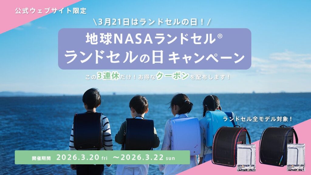 CHIKYU(東京都港区)は2026年3月20日~22日の3日間、公式ウェブサイトで「ランドセルの日キャンペーン」を実施します。クーポンコード「2027randayCK」をカートで適用し、ランドセル本体と対象ランドセルカバーを同時購入すると、カバーが100%引きで無料になります。