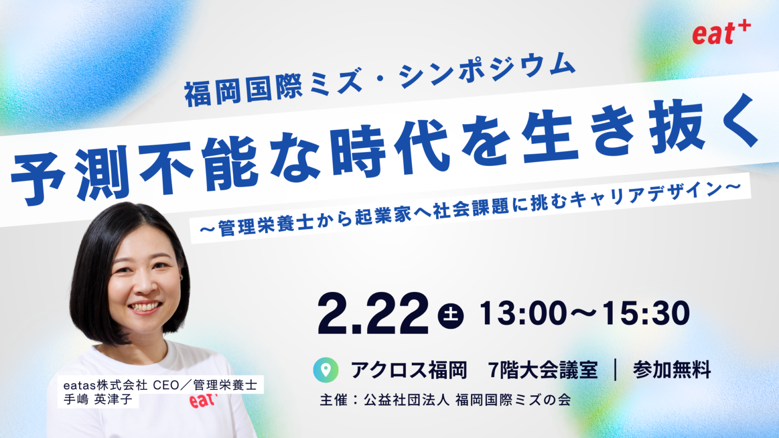eatas(福岡市中央区)の代表取締役・手嶋英津子氏は、2月22日(日)13:00~15:30にアクロス福岡(福岡市中央区天神1-1-1)で開かれる公益社団法人 福岡国際ミズの会のイベントに登壇します。参加費は無料で、対象は将来に悩む18〜29歳の女性です。福岡県と福岡市が後援します。