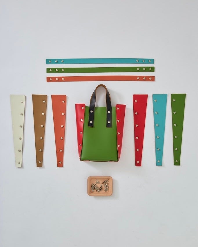 「assemble」ラインはリベットで組み立てる仕様が特徴で、パーツ単位の選択がしやすい点を体験に落とし込みます。対象バッグは「assemble hand bag tall」「assemble hand bag wide」の2型で、価格はSサイズ1万9800円、Mサイズ2万5300円、Lサイズ3万3000円です。