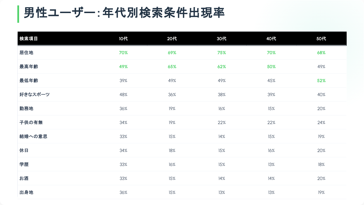 分析はアプリ内の行動データを性別・年代別に集計したもので、年代差は大きくなく、性別差が比較的明確に出たといいます。アプリ特性を反映し、4位には「好きなスポーツ」が入ったとしています。加えて「子供の有無」「結婚への意思」など将来を見据えた項目の設定が目立ち、「結婚への意思」は男女とも比較的上位でした。女性は「学歴」「最低年収」を条件に入れるケースが多い傾向も示されました。