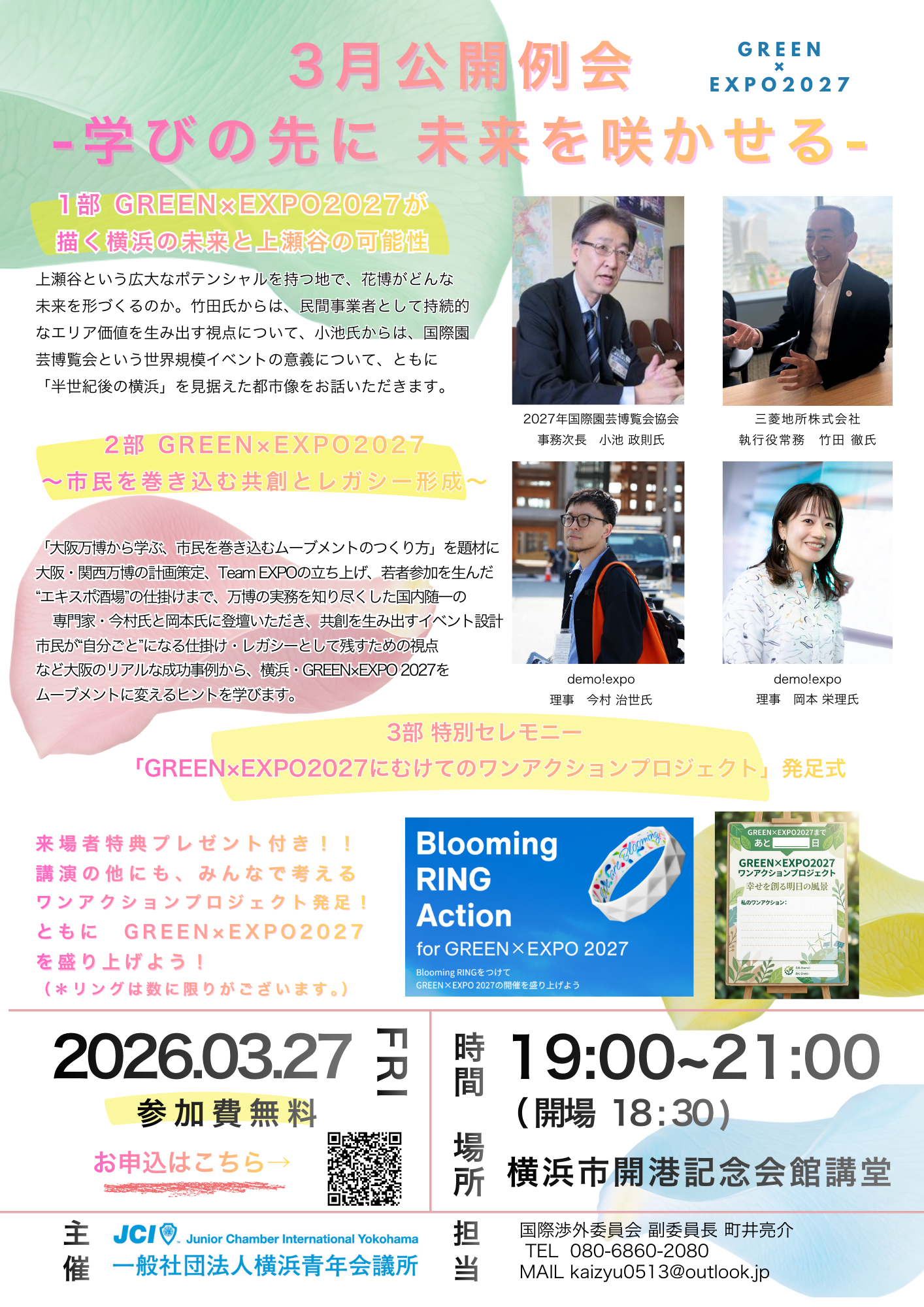 横浜青年会議所は3月27日(金)19時〜21時、横浜市開港記念会館の講堂(横浜市中区本町1-6)で、GREEN×EXPO 2027の開幕を見据えた3月公開例会を開きます。参加費は無料で、フォームから申し込めます。