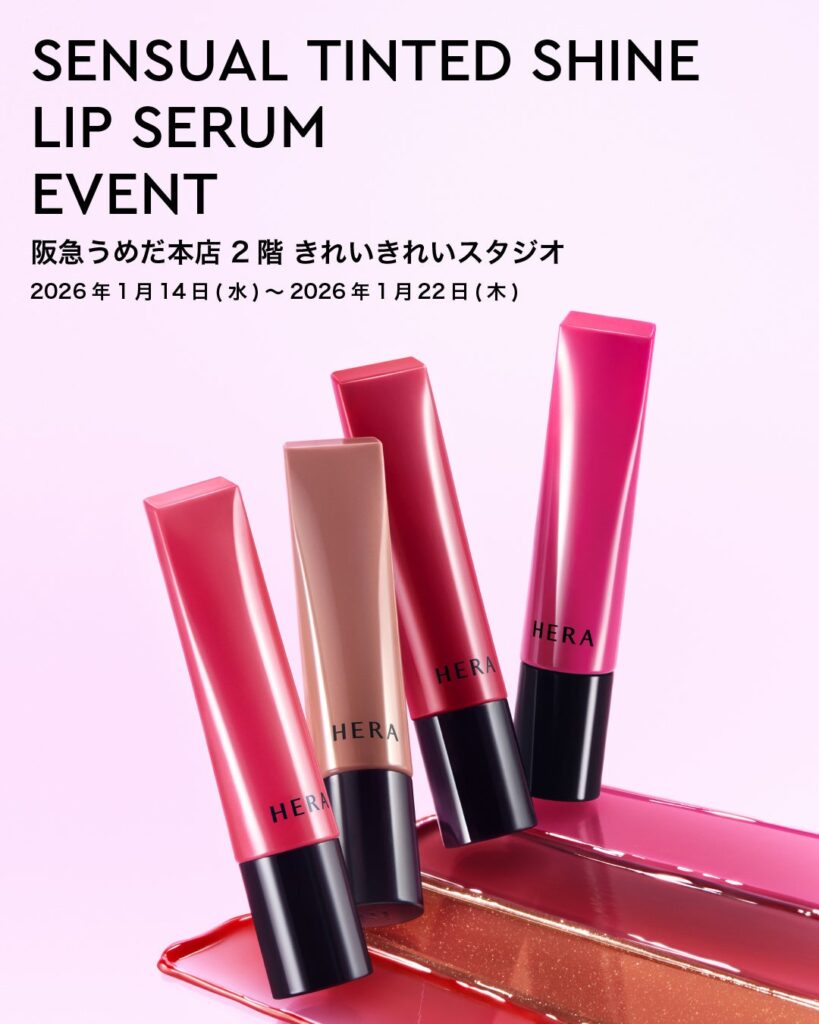 韓国・ソウル発のラグジュアリーメイクアップブランド「HERA(ヘラ)」が、新商品「センシュアル ティンティッドシャイン リップセラム」(8.5g、税込4,400円)を中心にしたイベントを阪急うめだ本店2階「きれいきれいスタジオ」で開きます。期間は2026年1月14日(水)~1月22日(木)の9日間です。会場ではイベント限定セット(税込10,780円、数量限定)も販売します。新作は全5色で、みずみずしいツヤ感と発色の持続を特徴とします。限定セットはリップセラム(色選択可)に加え、クッションファンデーション2種のいずれか(現品、選択可)などを組み合わせ、阪急うめだ本店のイベント会場のみで取り扱います。来店・購入特典も用意し、税込4,400円以上の購入でポーチを進呈するなど条件別に内容が変わります。スタンプラリーは合計3スタンプでリップスタンドケースが対象となり、押印は2月28日(土)まで3階HERAカウンターで継続します。期間中は韓国から専属メイクアップアーティストが来日し、予約制レッスン(60~90分)と先着のタッチアップ(約20分、購入条件なし)を実施予定です。新商品の体験機会に加え、レッスン枠の運用や特典の在庫状況が集客を左右しそうです。