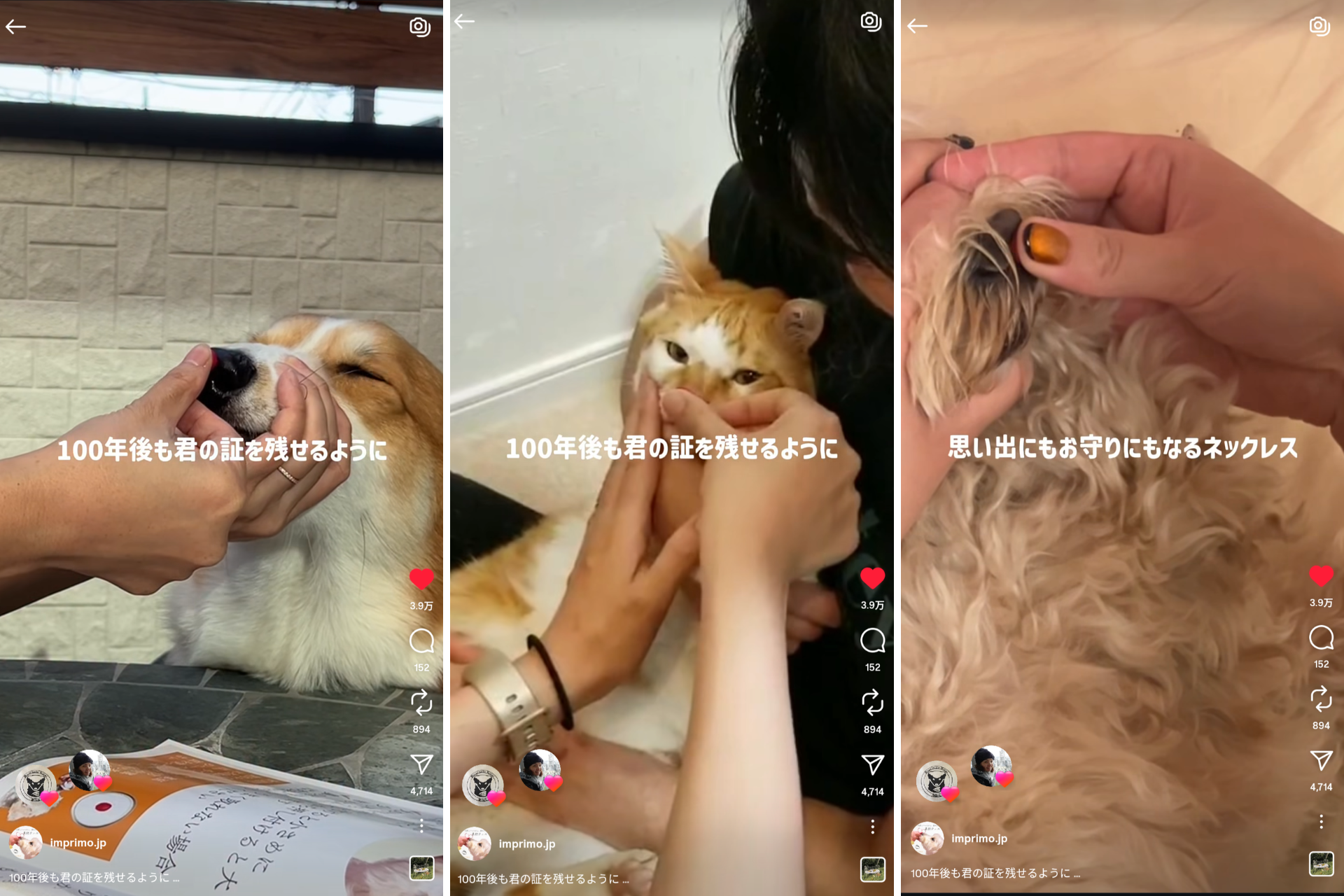 ペットの鼻紋を刻むメモリアルジュエリーを手がけるimprimoのInstagramリールが、公開から3日で再生500万回を突破。いいね約4万件、コメント150件を集めた。犬猫の鼻紋をワックスで型取りし、完成したジュエリーと飼い主の反応を短尺で見せる内容が拡散の起点となりました。