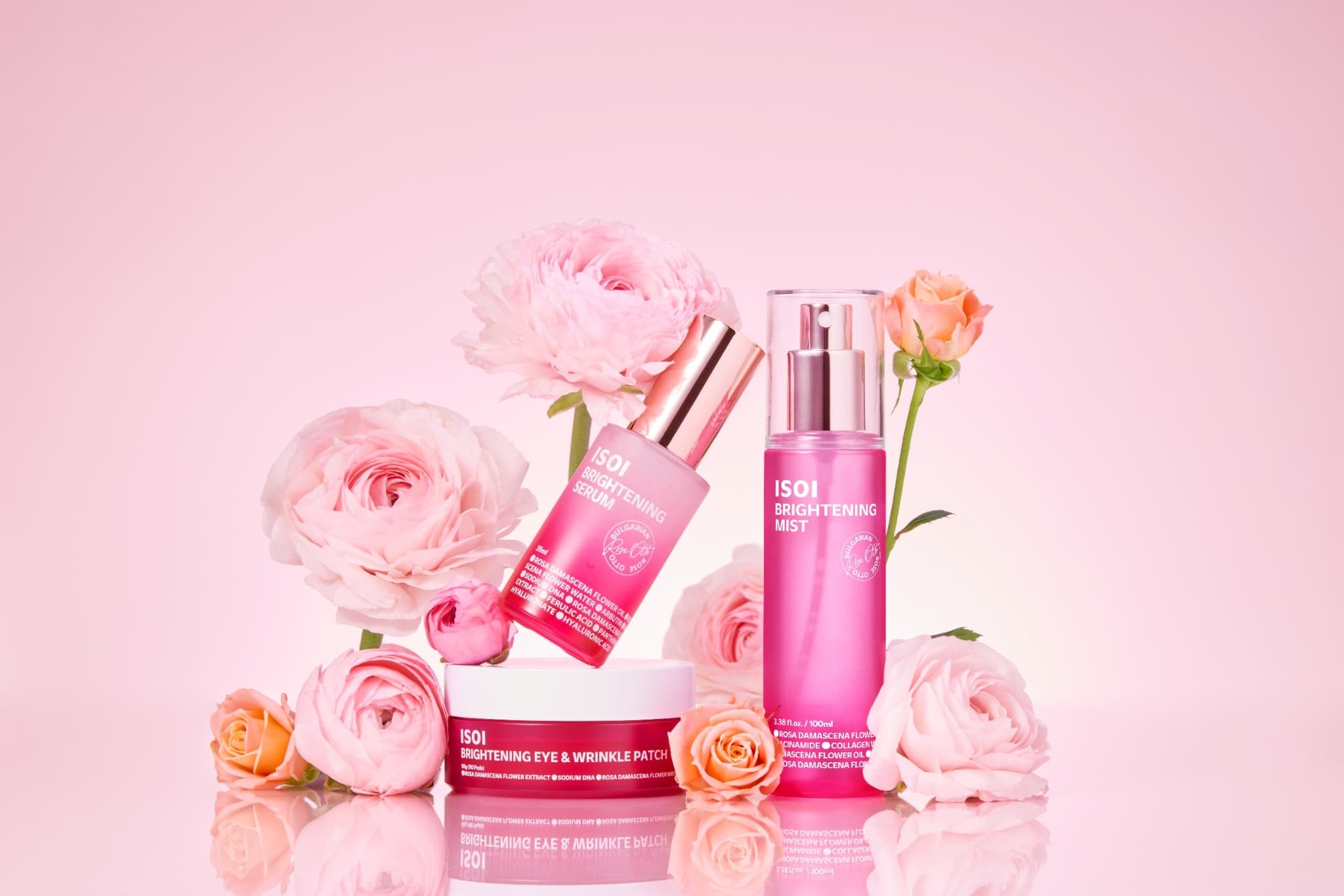 対象は「ブライトニング セラム」(35mL、3,267円)、「ブライトニング アイゲルパッチ」(90枚入、2,640円)、「ブライトニング ミスト」(100mL、2,420円)です。配合成分として希少な「ブルガリアンローズオットーオイル」をうたい、3,000本のバラからわずか1gしか抽出できないとしています。