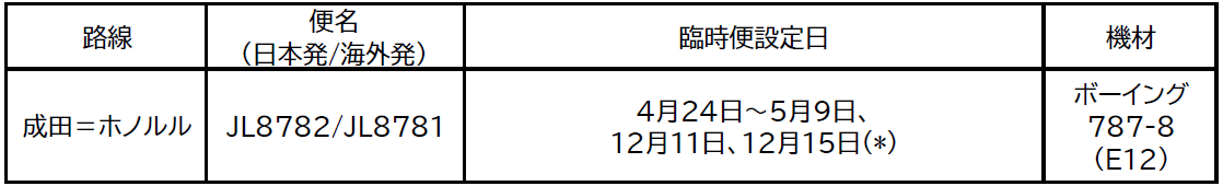 需要が高いゴールデンウイーク(GW)と年末年始には、ホノルル線で臨時便を設定します。あわせてボーイング777-300ER型機を投入し、機材を大型化します。大型化の対象便は昨年比で4倍以上としています。