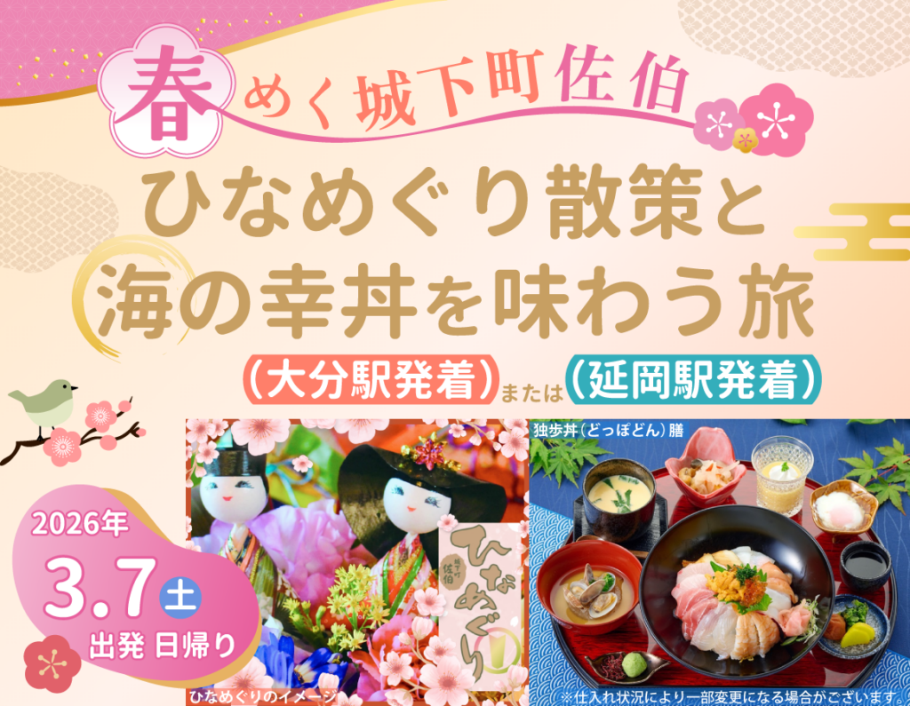 JR九州は、日帰りツアー「春めく城下町佐伯 ひなめぐり散策と海の幸丼を味わう旅」を2026年3月7日(土)に実施します。発着は大分駅と延岡駅で、旅行代金は大人(中学生以上)8,800円、こども(小学生)6,500円です。最少催行人員は大分駅発10人、延岡駅発10人としています。
