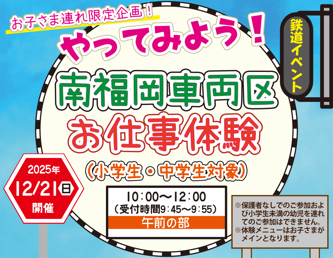 JR九州は2025年12月21日(日)、福岡市博多区の南福岡車両区で鉄道の車両検査業務を体験できるイベント「やってみよう!南福岡車両区お仕事体験」を実施します。募集人数は午前の部が10組20名、午後の部が16名で、参加費は大人1,000円・子ども7,000円、高校生以上7,000円としています。申込締切は12月14日(日)で、インターネット予約・クレジットカード決済限定です。