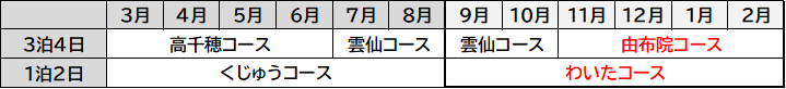 追加するのは、3泊4日「由布院コース」と1泊2日「わいたコース」です。内訳は雲仙コース3本、由布院コース6本、わいたコース13本に加え、「プレミアムな九州の旅」2本(五島/日南・霧島)も同期間で受付対象に含まれます。