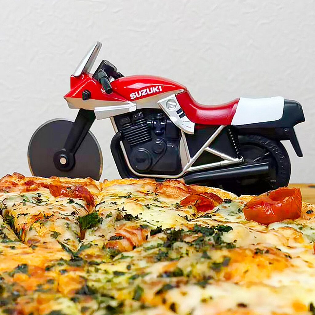 ピザカッターナはKATANAの前輪部分をカッターとして使うキッチン雑貨で、使用後は専用ホルダーにセットして飾れる仕様です。新色としてレッドを追加し、ギフト需要も見込みます。