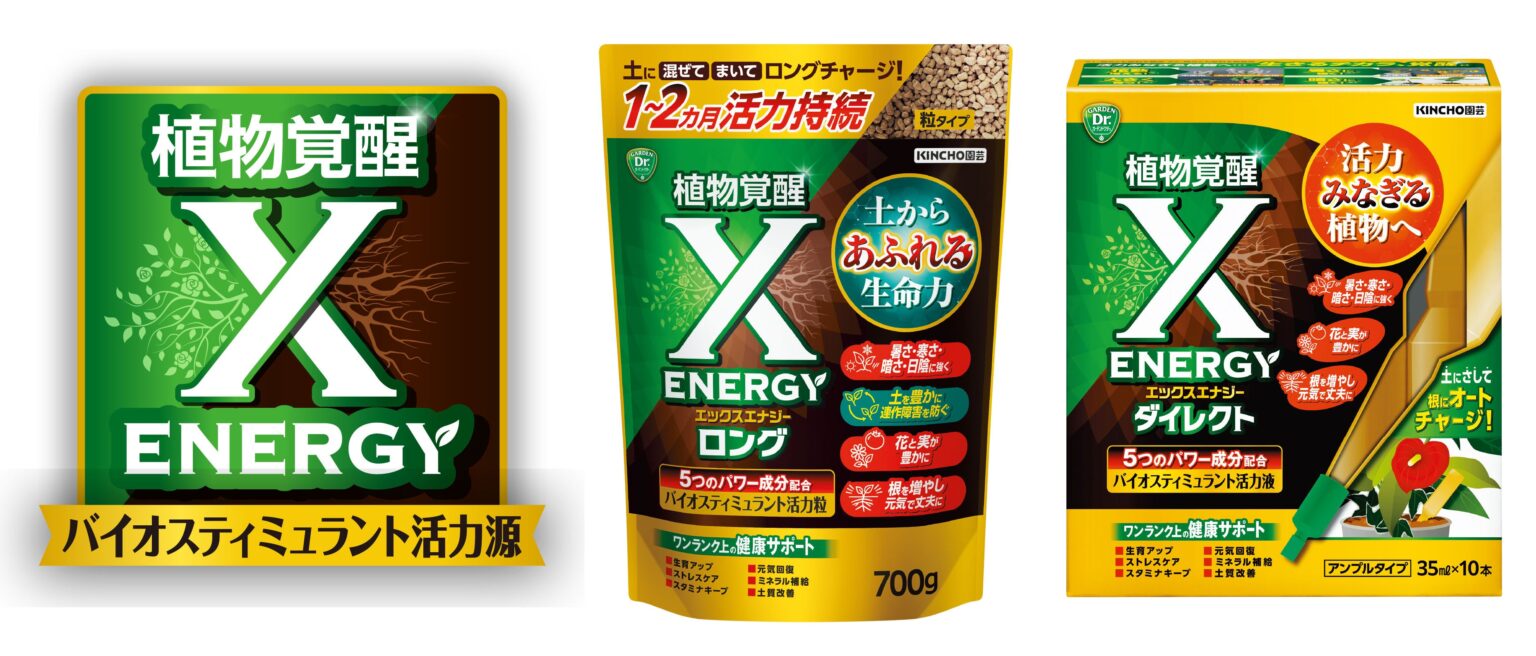 KINCHO園芸株式会社(東京都中央区)は2026年1月から、バイオスティミュラント活力液「X-ENERGY(エックスエナジー)」シリーズに「X-ENERGYロング 粒タイプ」(700g、1,089円・税込)と「X-ENERGYダイレクト アンプルタイプ」(35ml×10本、484円・税込)の2品を追加し、全国で順次販売します。