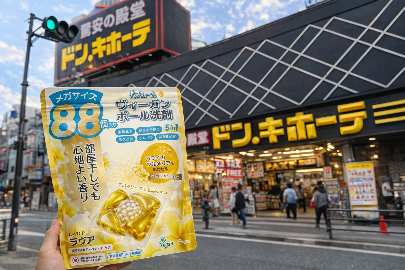 プレミアムヴィーガンライフスタイルブランド「LAVOIR(ラヴア)」は2026年3月30日、ドン・キホーテ全国約500店舗での取り扱いを開始し、新商品「ヴィーガンボール洗剤(プルメリア&ガイアック)88個入り」を先行発売します。価格は3,300円(税込)です。
