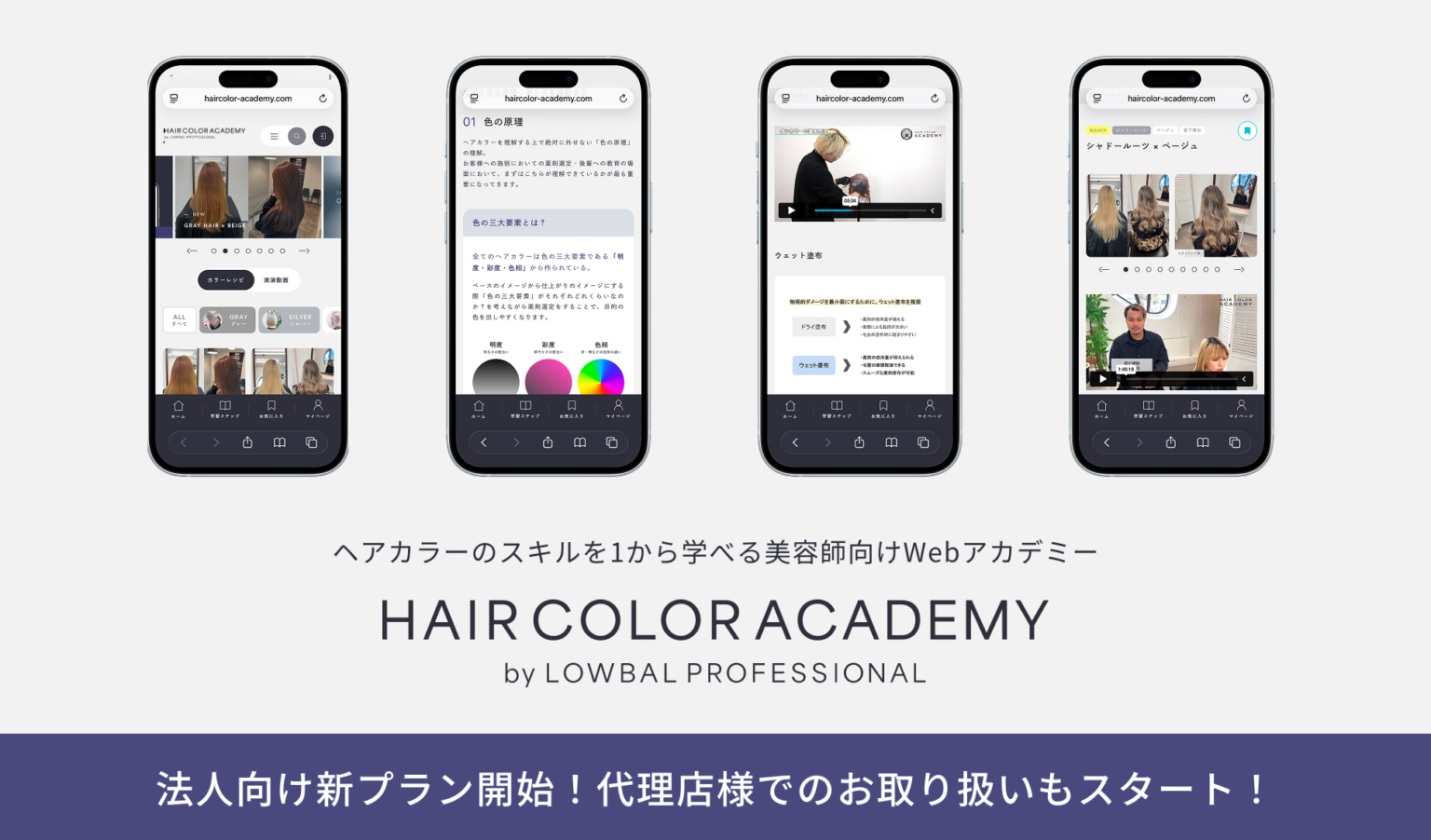 株式会社LOWBAL(東京都渋谷区)は2026年2月2日、ヘアカラー特化型オンラインスクール「HAIR COLOR ACADEMY」で、サロン単位の導入を支援する「法人プラン」を開始しました。料金は1法人あたり月額22,000円(税込)で、全国の代理店経由で取り扱います。