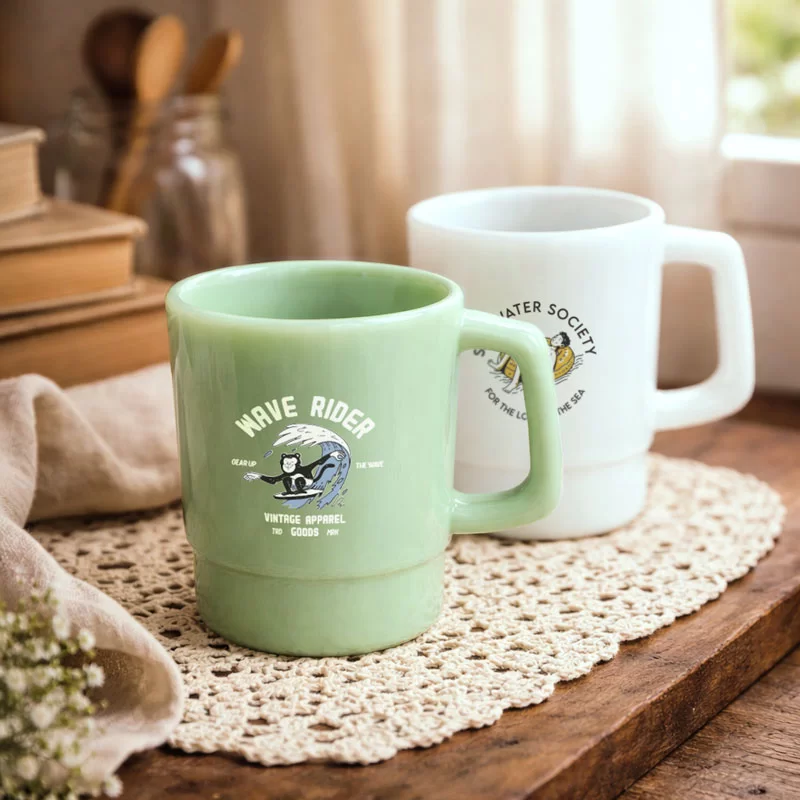 ME-Qは、アメリカのヴィンテージ食器で人気のミルクガラスを模した「ミルクガラススタイルマグカップ」のオリジナル作成サービスを始めました。容量は340mlで、カラーはグリーンとホワイトの2種類です。1個から注文できます。