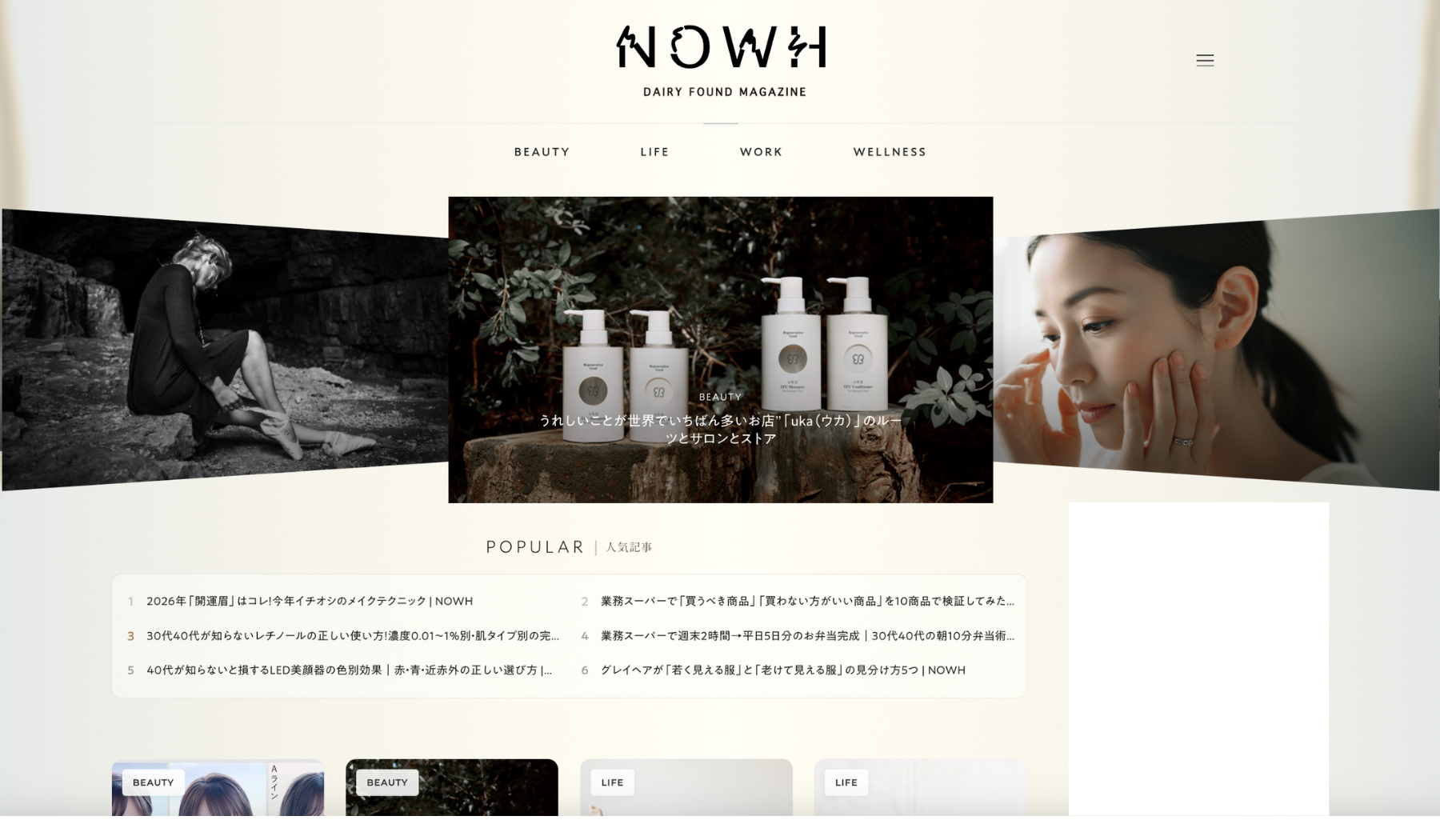 30〜40代女性向け美容・ライフスタイルメディア「NOWH(ナウ)」は1月22日11時01分、ブランドの“成り立ち”や“思想”を編集視点で整理・解説する新たな取り組みを始め、第1弾としてサロン発ビューティーブランド「uka(ウカ)」の原点と事業展開の背景をひも解く特集記事をWeb上で公開しました。対象読者は30〜40代です。