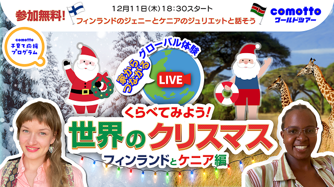 イベントでは、サンタクロースの故郷とされるフィンランドと、赤道直下のケニアをリアルタイムでつなぎ、両国のクリスマスの過ごし方を比較します。Zoomでの参加は「comotto 子育て応援プログラム」会員限定、YouTubeでの視聴は「comotto for Supporters」アプリ利用者が対象で、いずれも家庭から参加できる形式です。双方向コミュニケーションを取り入れ、英語と日本語によるサポートを行うことで、子どもが海外と交流しながら異文化に触れる仕組みとしています。