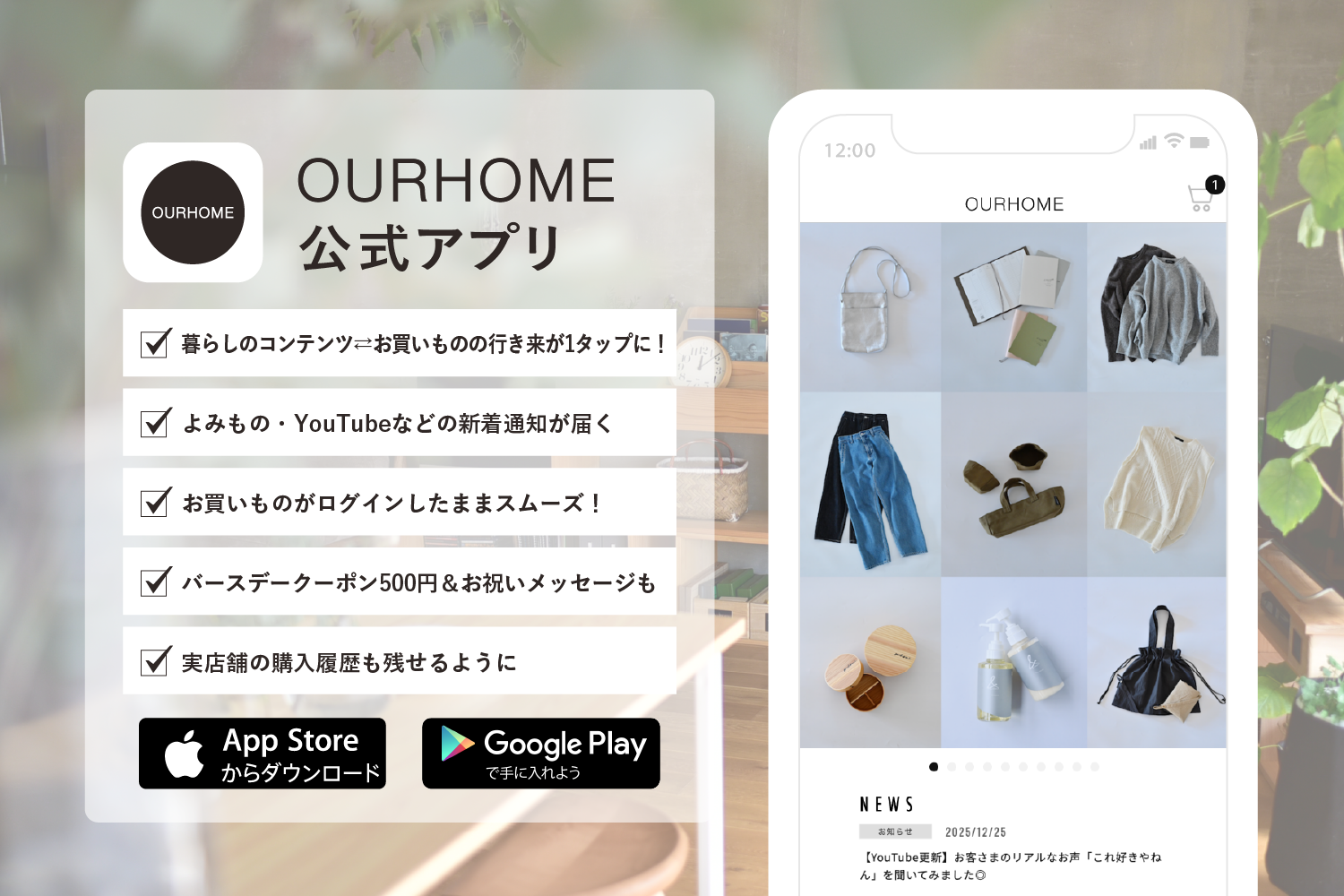 ライフスタイルブランド「OURHOME」(運営:株式会社i bridge、兵庫県西宮市)は2026年1月13日、コンテンツ閲覧からオンライン購入までをアプリ内に集約した「OURHOME公式アプリ」を公開しました。リリース記念として1月22日〜1月26日は、アプリ経由の注文に限り送料無料にします。OURHOMEはブログやSNS、動画、音声配信、ECなど複数チャネルで情報発信してきましたが、更新情報を見逃しやすいという課題を踏まえ、導線を一本化したとしています。アプリは、よみもの・YouTube等の新着や新商品・再入荷・キャンペーンをプッシュ通知で届け、ログイン維持により購入時の入力負担を軽減します。会員は誕生月設定で500円分のクーポンを受け取れるほか、オンラインに加え実店舗の購入履歴も記録可能です。今後は購買履歴の活用により、店舗での相談やオンラインでのリピート購入の利便性向上が焦点となりそうです。【キャンペーン情報】