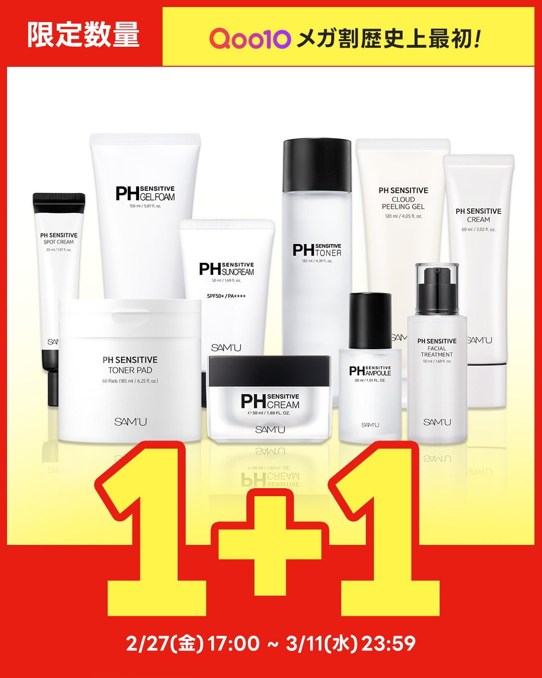 韓国発スキンケアブランド「SAM’U(サミュ)」は、Qoo10「メガ割」で2026年2月27日17時から3月11日23時59分まで、PHセンシティブラインを中心に本品購入で同一商品がもう1個付く「1+1」などの特別プロモーションを行います。PHセンシティブクリーム(60ml)は参考9,000円に対し3,300円(63%オフ)です。