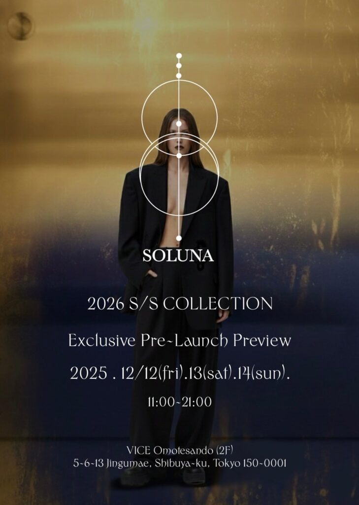 ファッションブランド「SOLUNA」は、2026年春夏コレクションの先行プレローンチ・プレビューを2024年12月12日から14日までの3日間、東京・表参道で行います。時間はいずれの日程も11時から21時までで、会場は「ヴァイス表参道(2F)」(東京都渋谷区神宮前5-6-13)です。