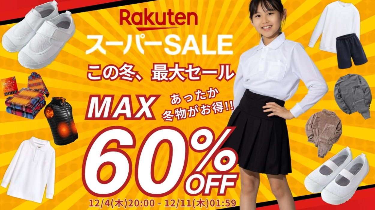 スクール用品ブランド「SunnyHug」を展開する株式会社新陽トレーディングは、楽天市場のスーパーSALEで最大60%OFFの値引きを行います。期間は2025年12月4日20時〜12月11日1時59分。学生用品からルームウェア、生活雑貨までを対象とし、来年度の通学準備と冬の防寒ニーズに対応します。