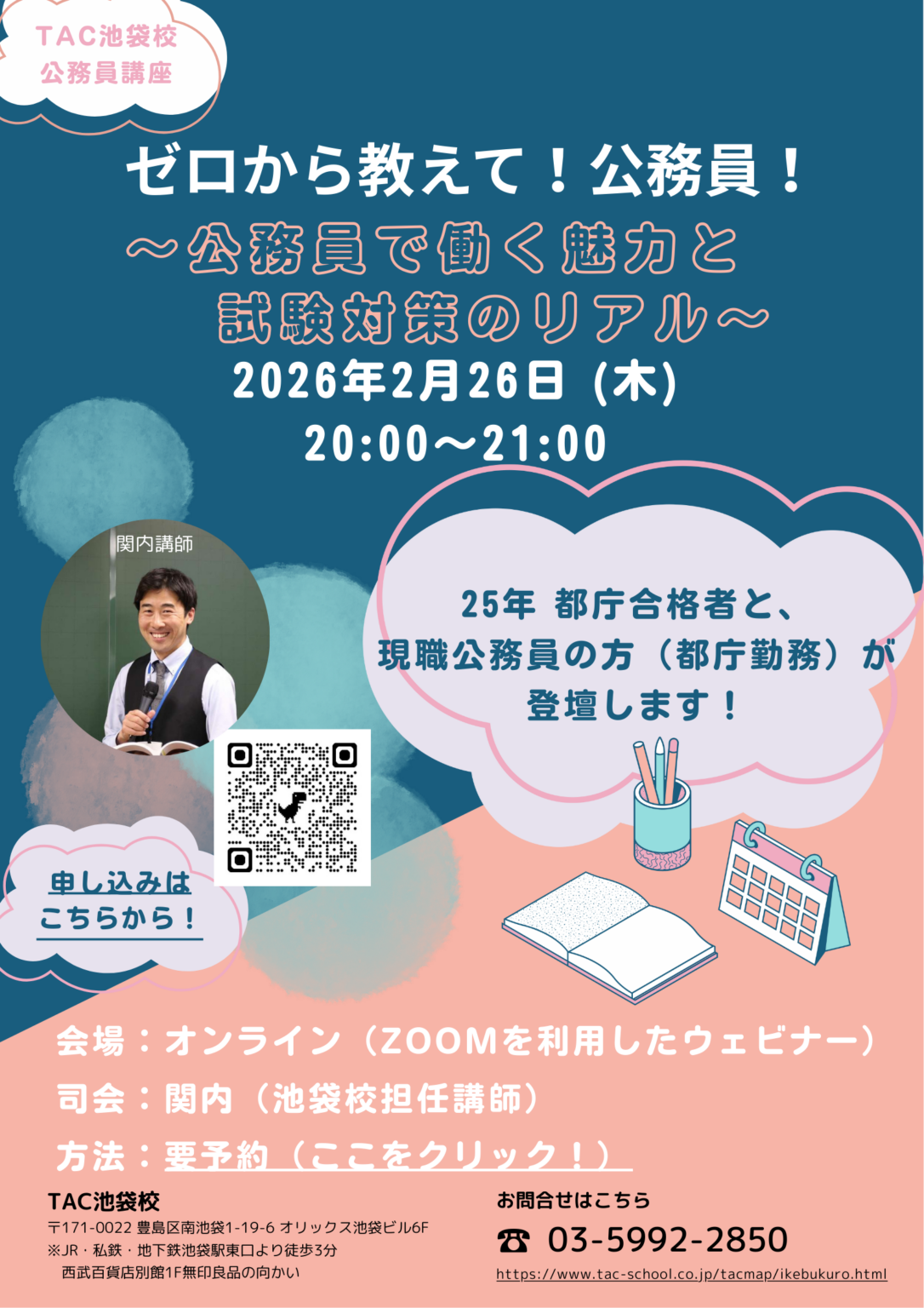 TAC(東京都千代田区)は2026年2月26日(木)20時から、ナイトガイダンス「ゼロから教えて!公務員!~公務員で働く魅力と試験対策のリアル~」をZoomでオンライン開催します。参加は無料の予約制で、TAC池袋校から配信します。