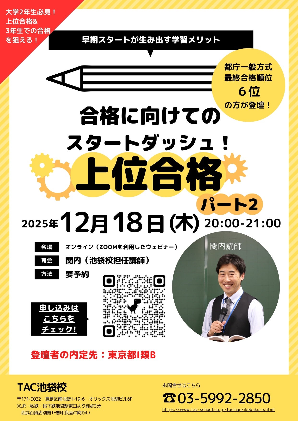 資格の学校TACは、2025年12月18日(木)20時〜21時に、公務員試験の上位合格を目指す大学2年生を主な対象としたオンラインイベント「合格に向けてのスタートダッシュ!公務員試験上位合格への道 パート2」を開催します。参加費は無料で、Zoomを利用した配信形式です。終了後には質問・相談の時間も設けられます。
