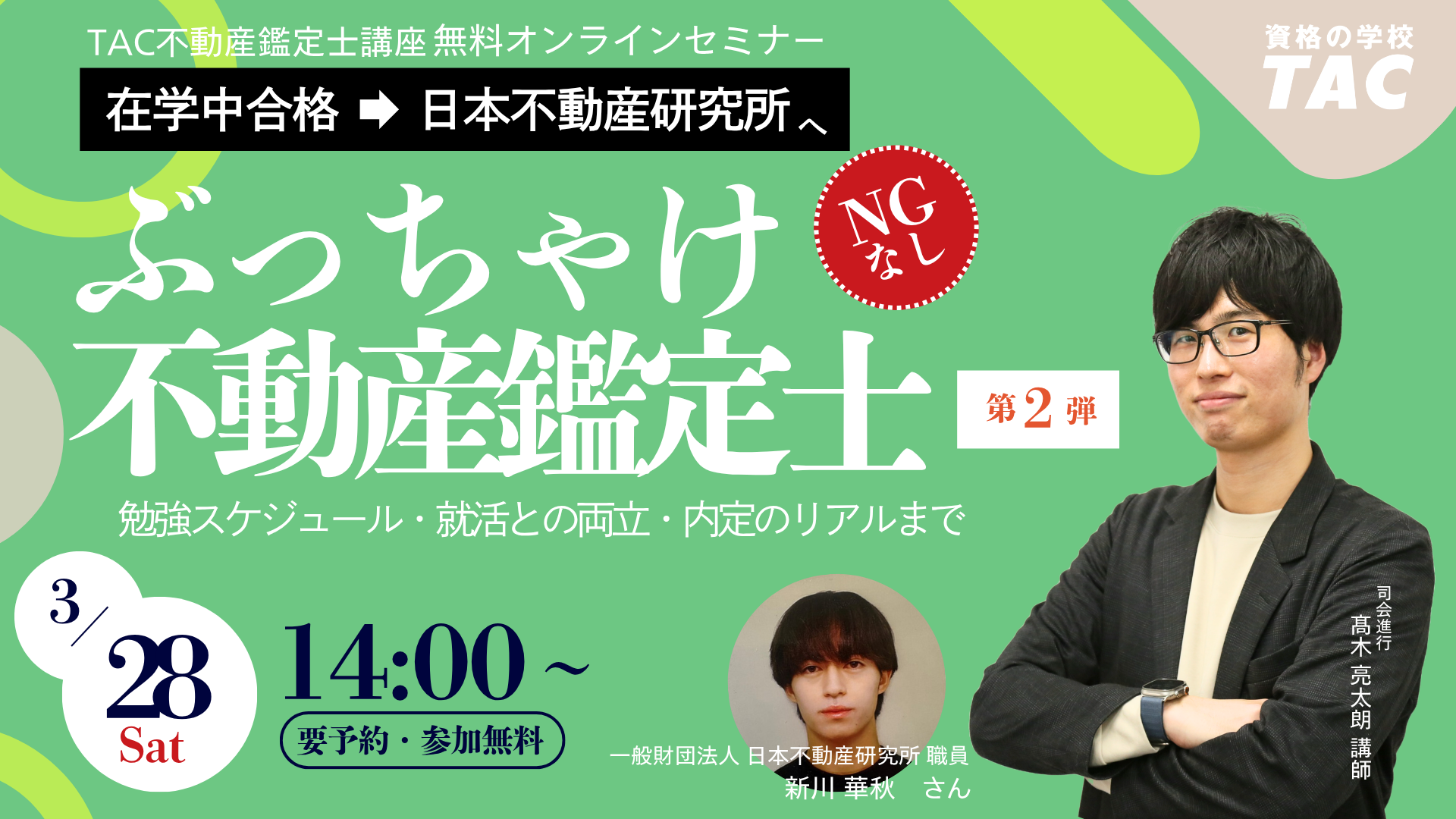 資格予備校のTAC(東京都千代田区)は、不動産鑑定士のキャリアに関心がある学生や転職希望者向けのオンラインイベントを2026年3月28日14時から開きます。ゲストは一般財団法人日本不動産研究所の新川華秋さんで、予約制です。