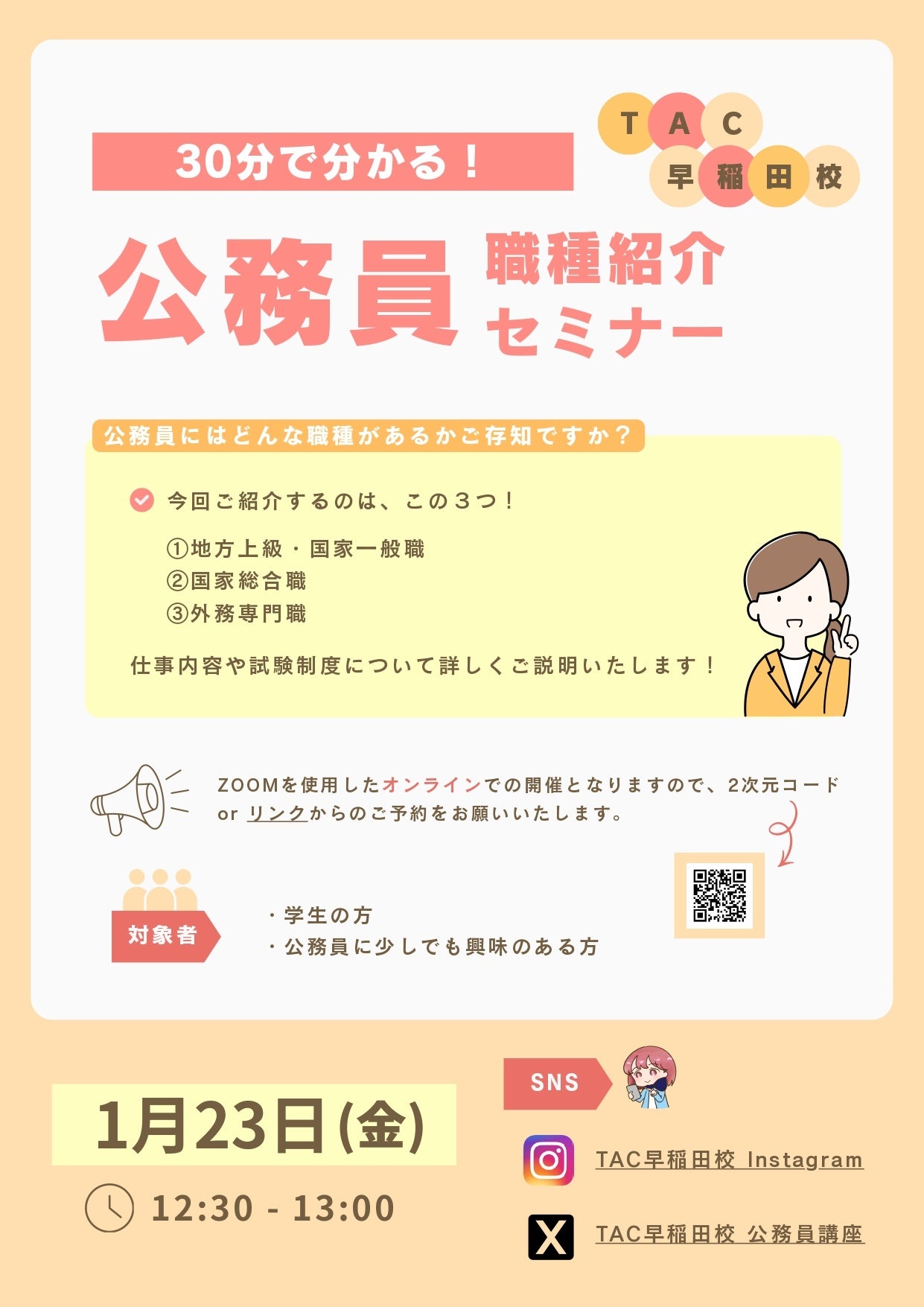 TAC公務員は2026年1月23日12時30分から、オンラインセミナー「30分で分かる!公務員の職種紹介セミナー」をZoomで開きます。配信拠点はTAC早稲田校で、参加は無料、事前予約制です。