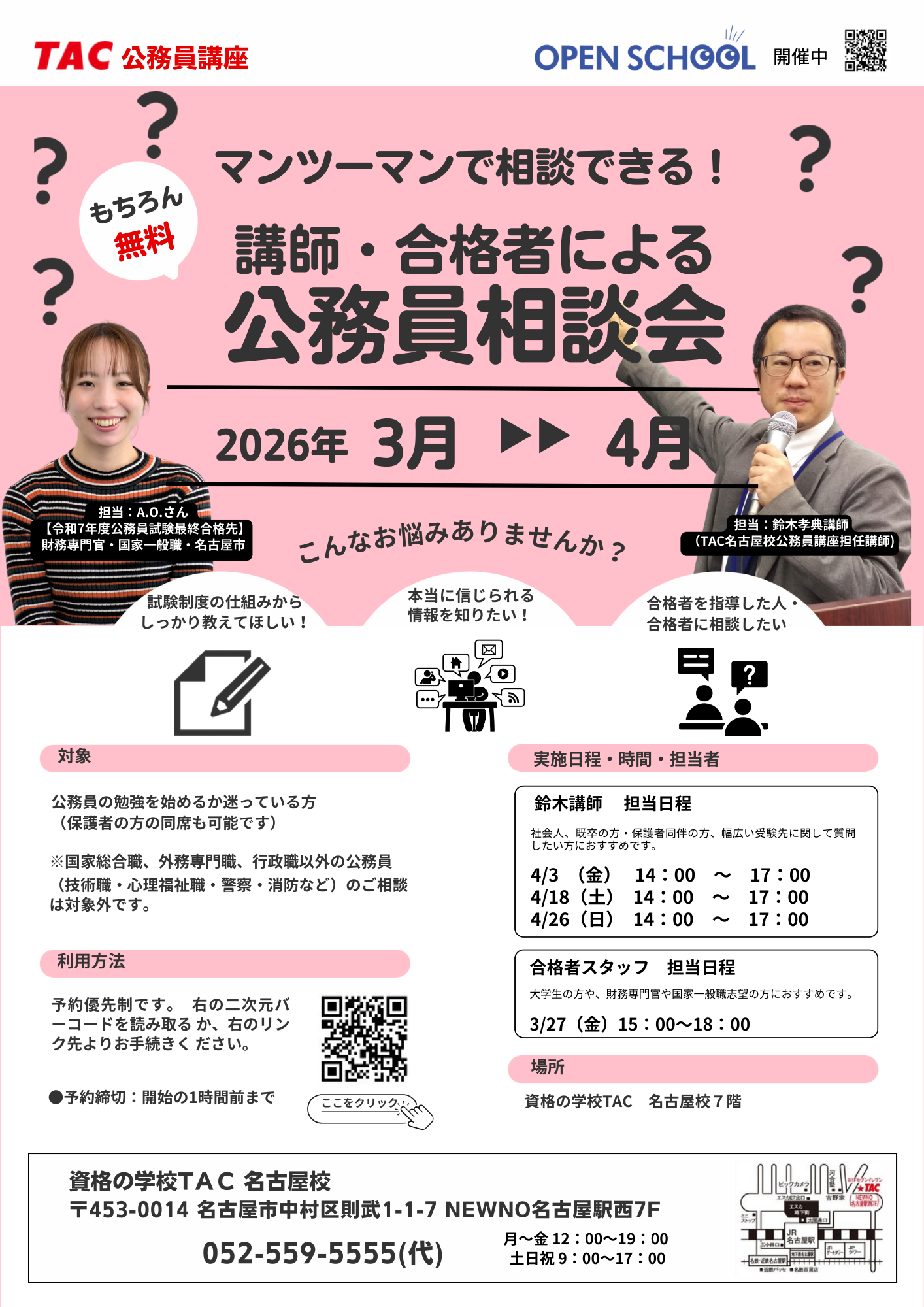 TAC名古屋校(名古屋市中村区)は、公務員試験の受験を検討する人向けに「担任講師・合格者個別受講相談会」を開きます。日程は2026年3月27日15:00~18:00と、4月3日・18日・26日14:00~17:00の計4回で、参加費は無料です。予約優先制で、保護者の同席も可能です。