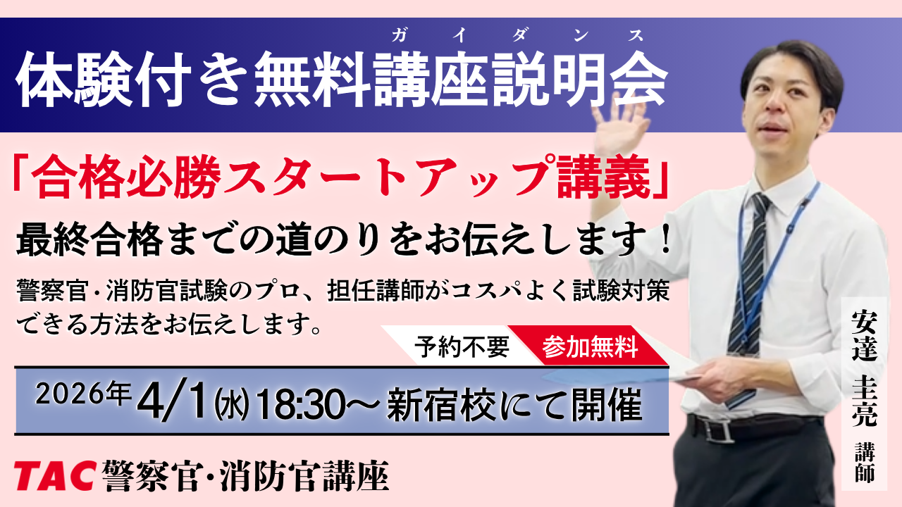 TACは2026年4月1日(水)18時30分から、警察官・消防官(消防士)など公安職の採用試験を検討する人向けに、無料講義「合格必勝スタートアップ講義~合格までの道のりをお伝えします~」をTAC新宿校(新宿区西新宿1-21-1 明宝ビル9F)で開きます。予約不要で参加費は無料です。講師は担任の安達圭亮氏です。