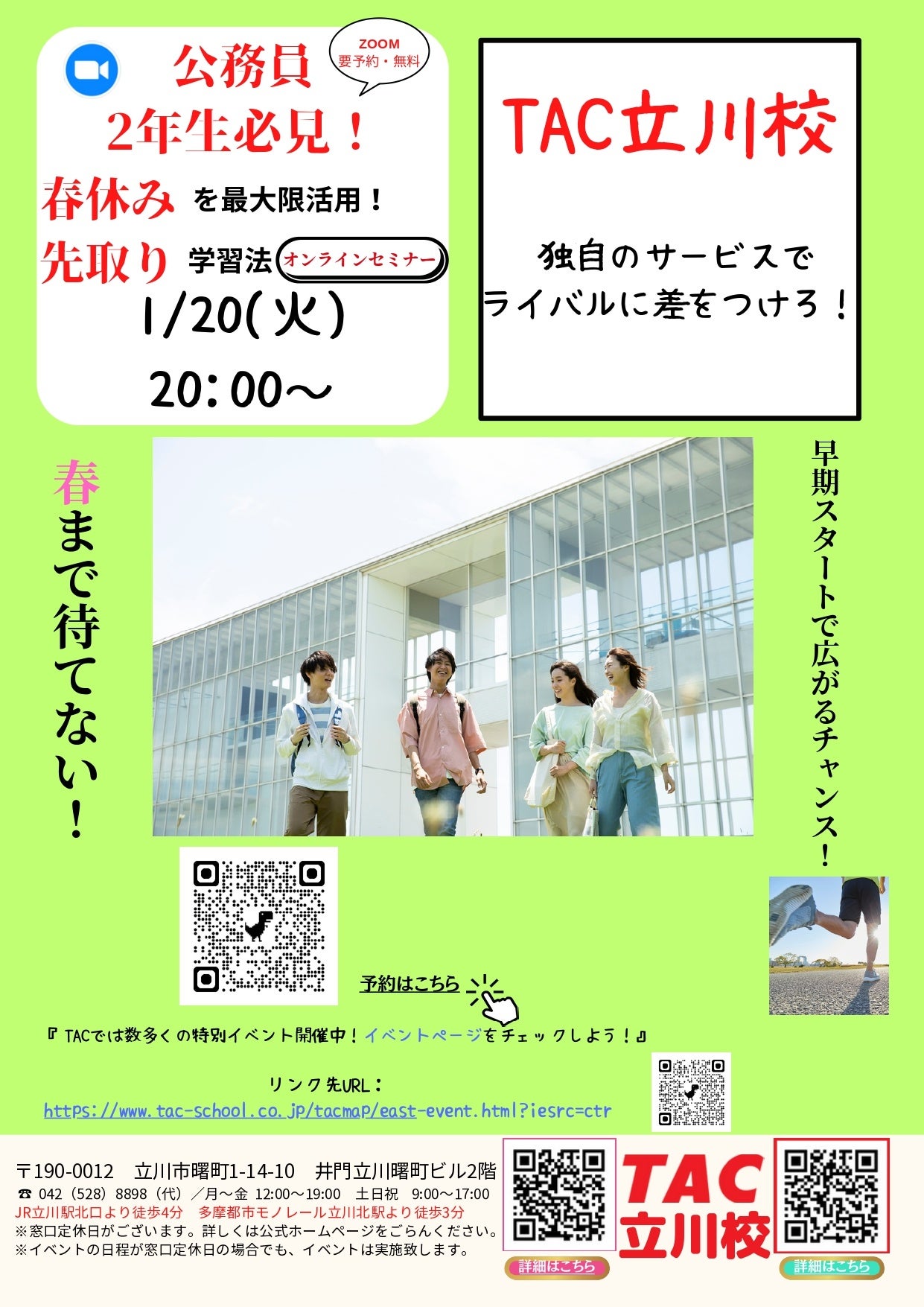 TAC公務員講座(立川校)は2026年1月20日(火)20時から、大学2年生を主対象にしたオンラインセミナー「立川校独自のサービスでライバルに差をつけろ!大学2年生向けセミナー」をZoomで開きます。参加費は無料で、専用フォームによる事前予約制です。登壇は立川校担任講師の須田佑介氏が務めます。近年、大学3年生から受験できる新方式が広がっている動向を踏まえ、新試験制度の概要を説明するほか、対策を早めに始めるメリットや受験計画に合わせたコース選択の考え方を紹介します。あわせて、学習相談などを含む立川校独自のサポート内容も案内するとしています。さらに、講座関連では「2027年合格目標 先取り学習つき総合本科生」を期間限定で2万2,000円割り引くキャンペーンも告知しており、早期スタート需要の取り込みを狙います。今後は新方式の定着度合いに応じて、若年層向けの情報提供やコース設計の拡充が進む可能性があります。