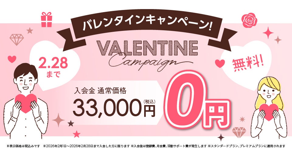割引は入会時の初期費用のうち入会金に適用され、入会後は登録費や月会費、活動サポート費などが別途発生します。バレンタイン期に合わせ、入会時の負担を下げて婚活開始を後押しする狙いです。