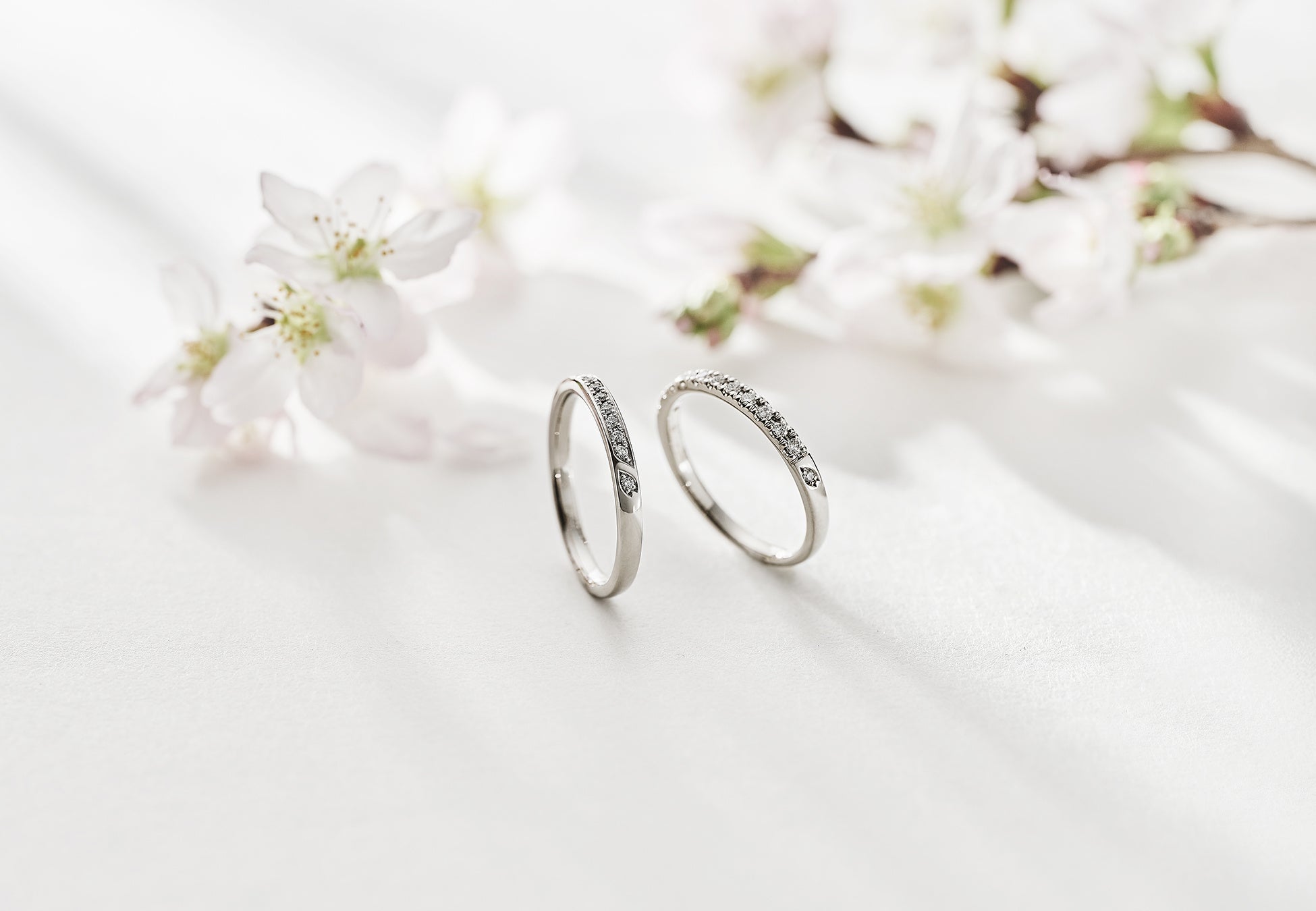 発売するのは、リングの中指側に桜の花びらを表現した一粒を施したデザインです。「桜ひらり」は彫り留め風、「桜きらり」は爪留めタイプで、いずれも素材はプラチナ950です。花びら部分のメレ(小粒石)は、ピンクダイヤモンドまたはピンクサファイアへアレンジできます。