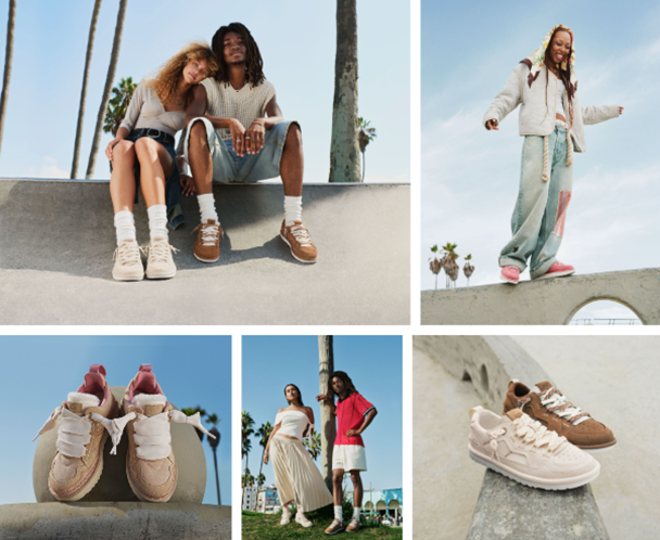 「Lowmel Meadow(ローメル メドウ)」は刺繍ディテールを加え、UGGplush™ライニングやサトウキビ由来の超軽量EVAアウトソールで快適性の持続を狙います。オーバーサイズのパッド入りタンや幅広シューレースでストリートウェア要素も強めました。新登場のMinimelはスエードと100%リサイクル繊維の混合素材アッパー、デュアルレースシステム、スリムでロープロファイルなシルエットを特徴とし、ストリート感と快適性の両立を掲げます。今後は動画・スチールで南カリフォルニア由来のヘリテージを表現し、屋内外で一年中体感できるブランド体験へ発展させる方針です。