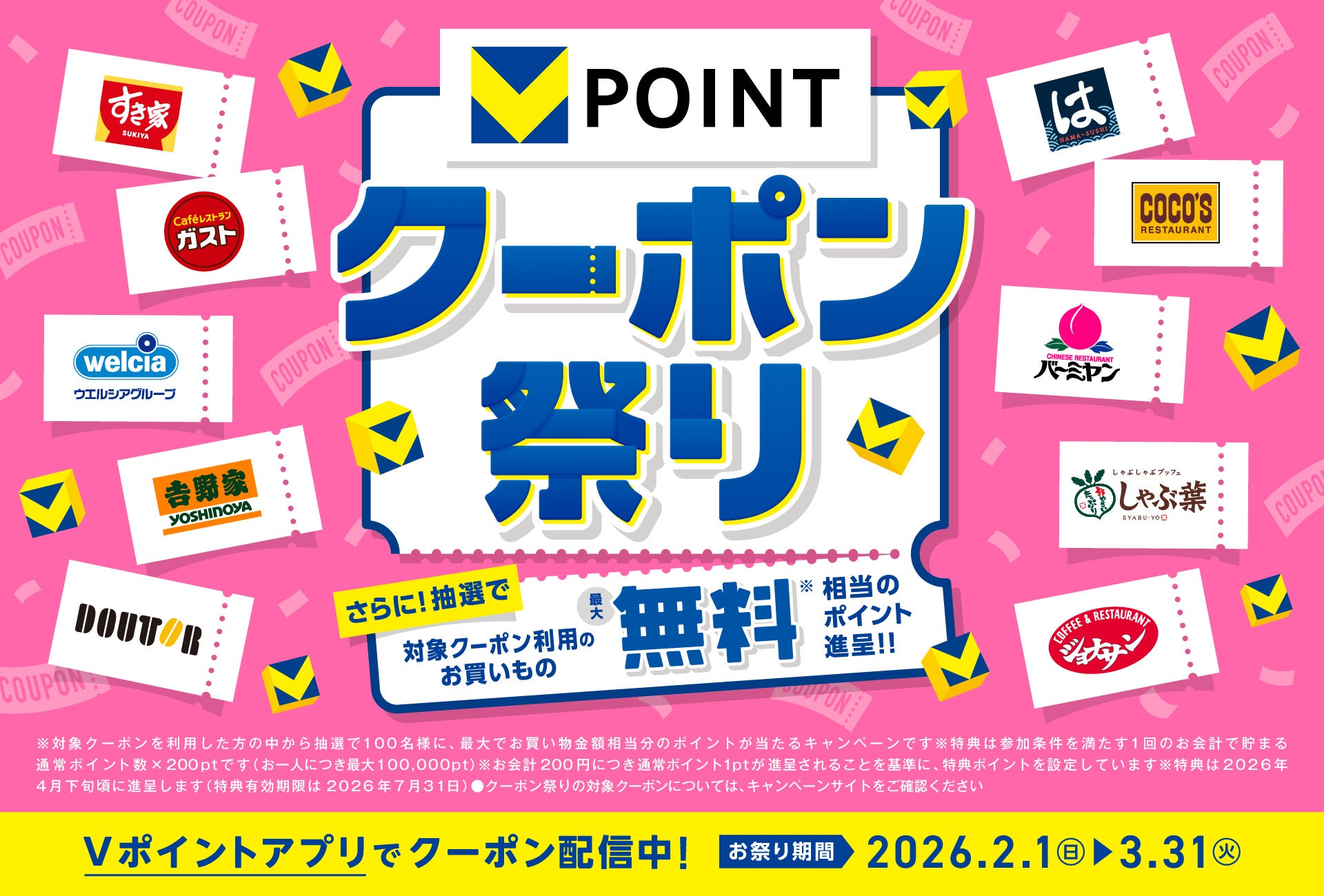 CCCMKホールディングス(横浜市)は2026年2月1日~3月31日、Vポイントが貯まりやすくなる「クーポン祭り」を実施します。モバイルVカード対応店舗全店で使える「毎週配信!1週間ずっと2倍クーポン」を配信し、抽選100人に最大で買い物金額相当のVポイント(上限10万pt)が当たる企画も行います。