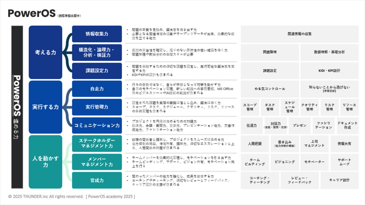 PowerOS研修は、AIや業務ツールの普及で専門スキルの希少性が下がる一方、「物事を整理し、他者を巻き込み、最後までやり切る力」が不足しているという課題を背景に開発されました。150名超の起業家やIPO経験者、3,000名超のマーケターの事例から成果を出す人材の共通点を抽出し、「考える力」「実行する力」「人を動かす力」の3分野・29スキルに分解して可視化した点が特徴です。