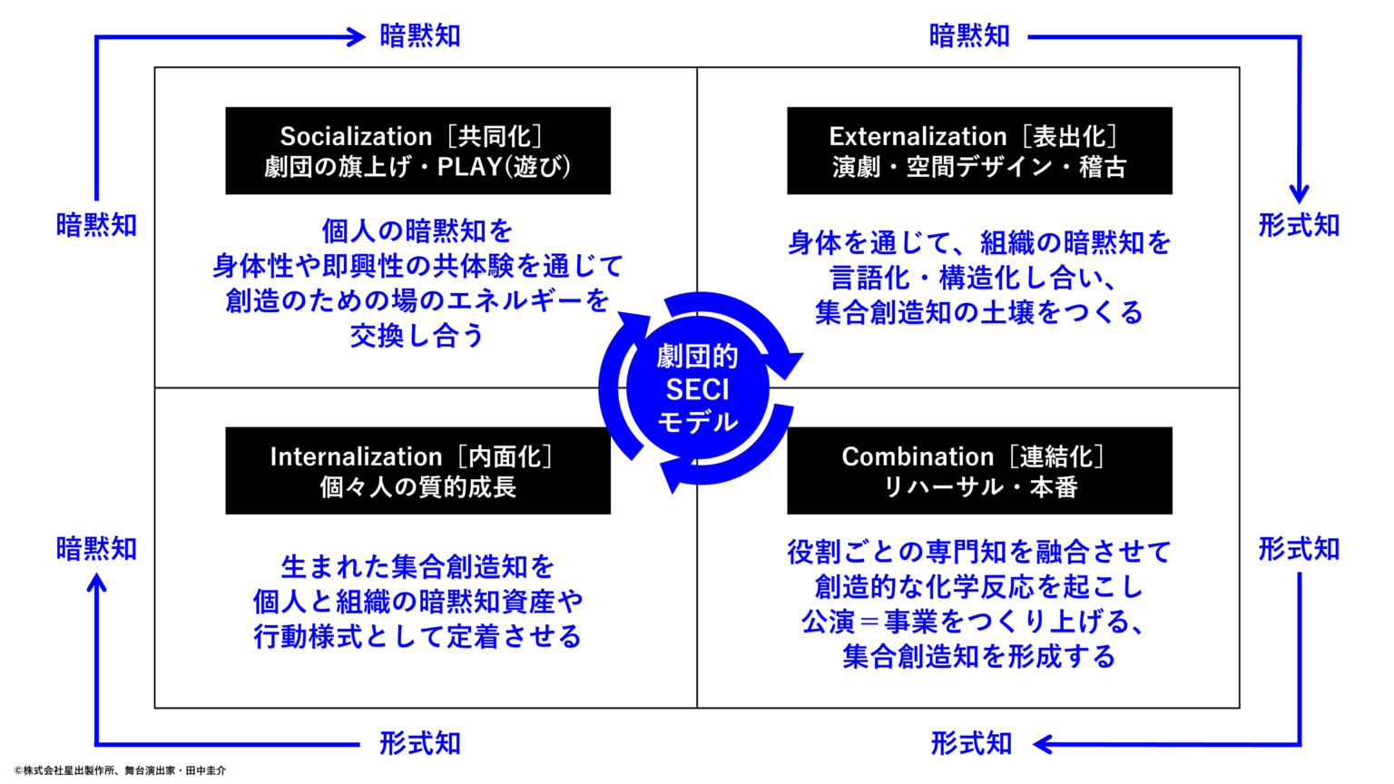 中核となるのは、演劇現場の役割分担を協働の比喩として用いる「集合創造知のメソッド」と、知識創造理論のSECIモデル(共同化・表出化・連結化・内面化)を演劇プロセスに即して再構築した「劇団的SECIモデル」だ。事前ヒアリング後、身体を使うウォームアップ、チーム演習、課題を題材にした集団創作と上演、ふりかえりと行動宣言までを行う。今後は企業に加え、自治体やまちづくりなど多様な関係者が関わる共創設計への展開も見込まれる。