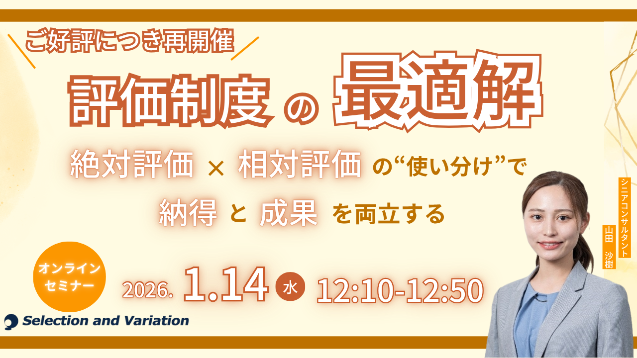 人事コンサルティングのセレクションアンドバリエーション株式会社は、評価制度をテーマにしたオンラインセミナー「評価制度の最適解 ― 絶対評価×相対評価の“使い分け”で、納得と成果を両立する ―」を、2026年1月14日(水)12時10分〜12時50分に開催します。Zoomを使ったライブ形式で、参加費は無料です。