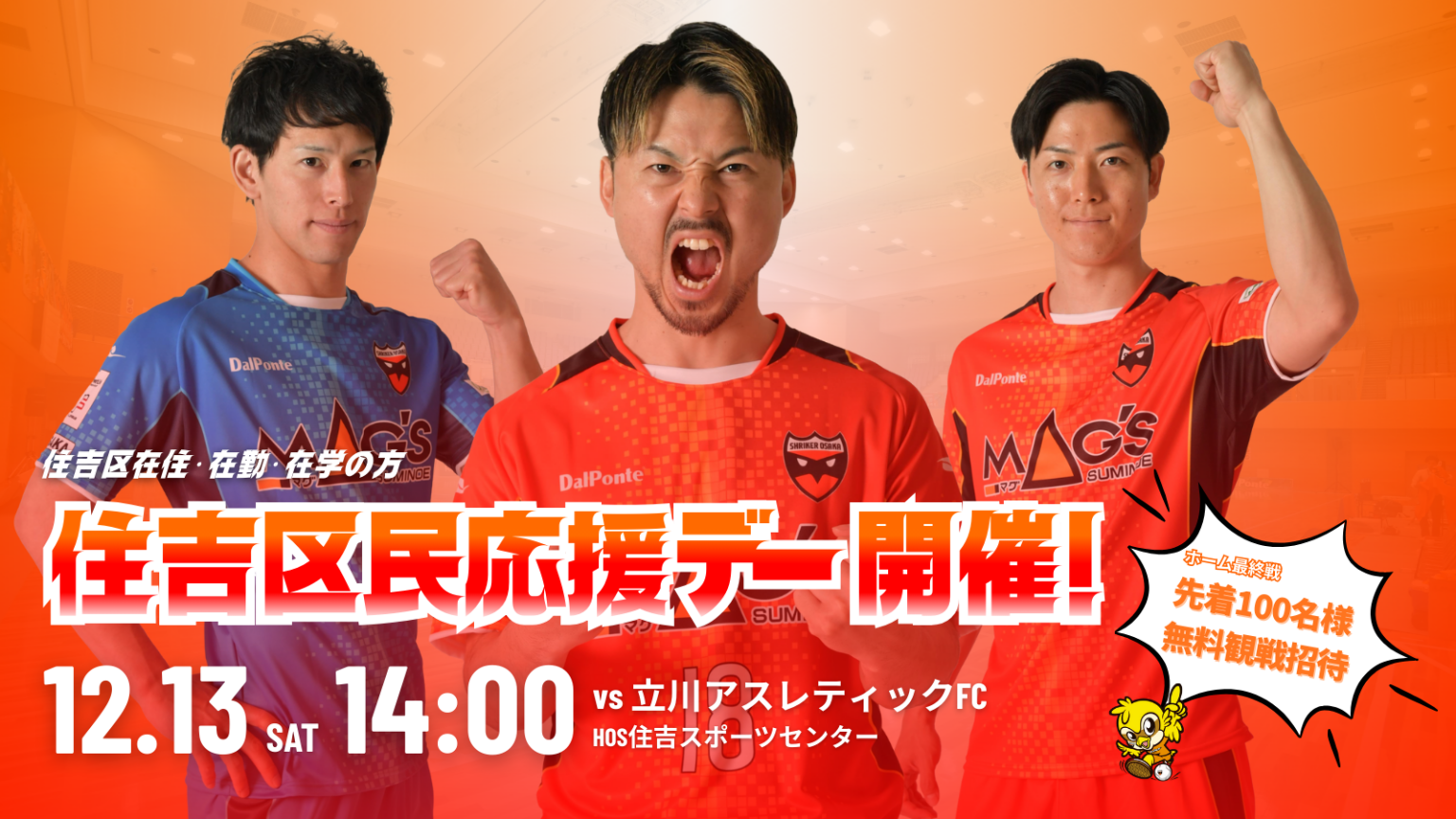 プロフットサルクラブのシュライカー大阪は、メットライフ生命Fリーグ2025-26ディビジョン1第21節・立川アスレティックFC戦を、12月13日(土)14時からHOS住吉スポーツセンター(大阪市住吉区浅香1丁目8-15)で開催し、住吉区在住・在勤・在学の方先着100人を無料招待します。今季リーグのホーム最終戦に合わせ、「住吉区民応援デー」として地元に門戸を開く形です。