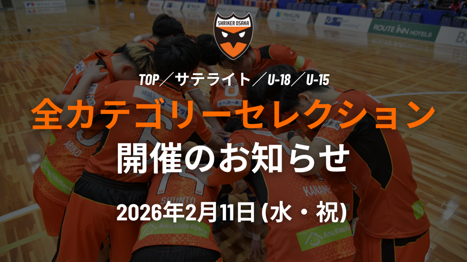 シュライカー大阪は、2026年2月11日(水・祝)に行う全カテゴリー(TOP・サテライト/U-18/U-15)セレクションの応募期間を延長し、申込期限を2月10日(火)18時00分までとしました。会場はマグフットサルスタジアムで、参加費は2,000円(税込)です。