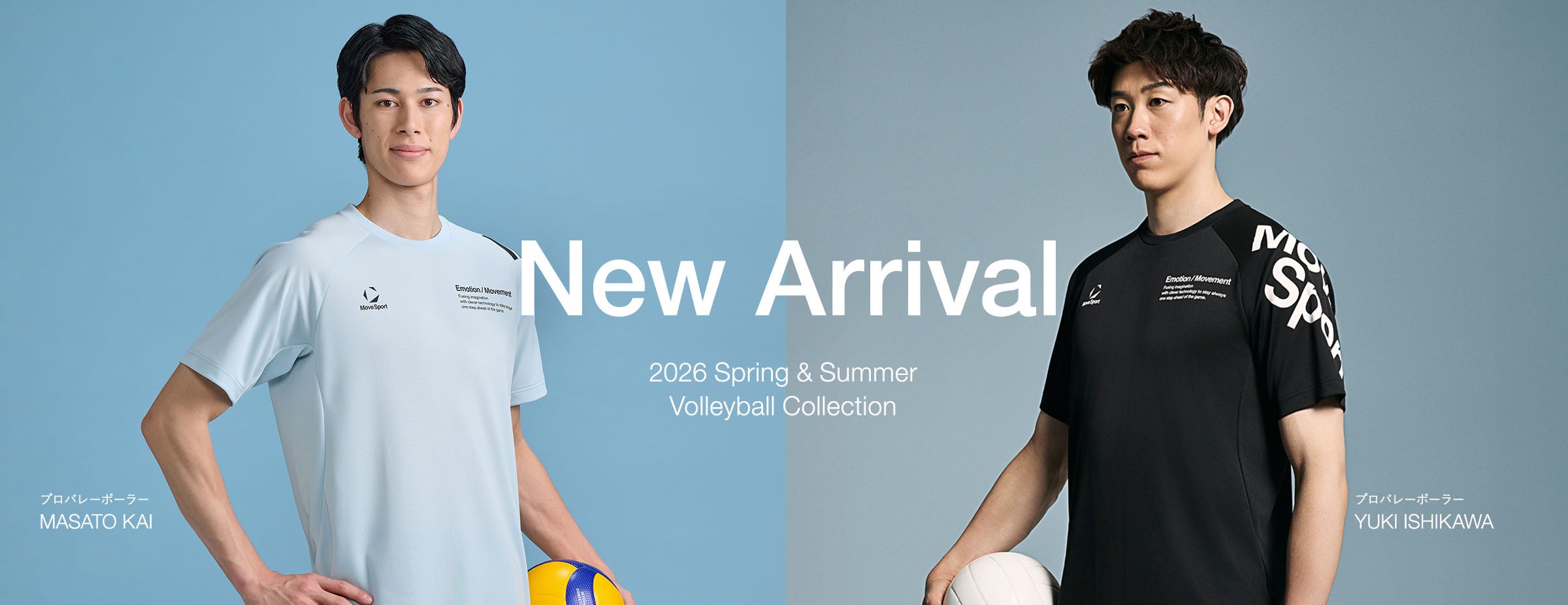 MoveSportは一般消費者と競技者を対象に、専用設計のプラクティスシャツを軸として、開発力と機能性、躍動感のあるデザインでプレー時の動きを支えるとしています。起用選手として石川祐希選手、甲斐優斗選手の名前も挙げています。