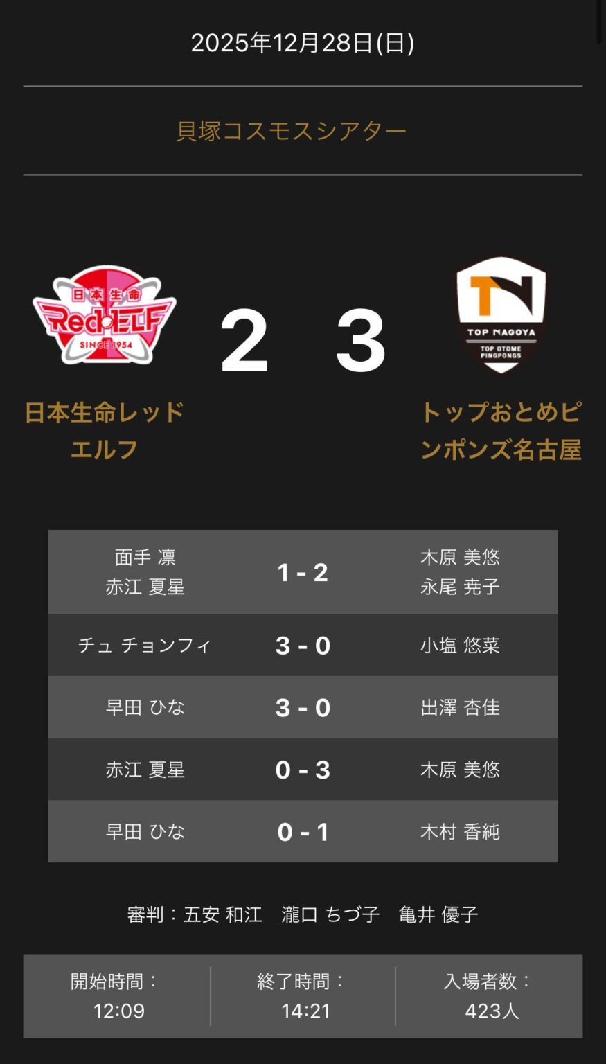 ノジマTリーグ2025-2026シーズンの公式戦が2025年12月28日に行われ、トップおとめピンポンズ名古屋が日本生命レッドエルフに3-2で勝ちました。勝敗は最終的に1点差で決まり、両チームが最後までもつれる展開となりました。