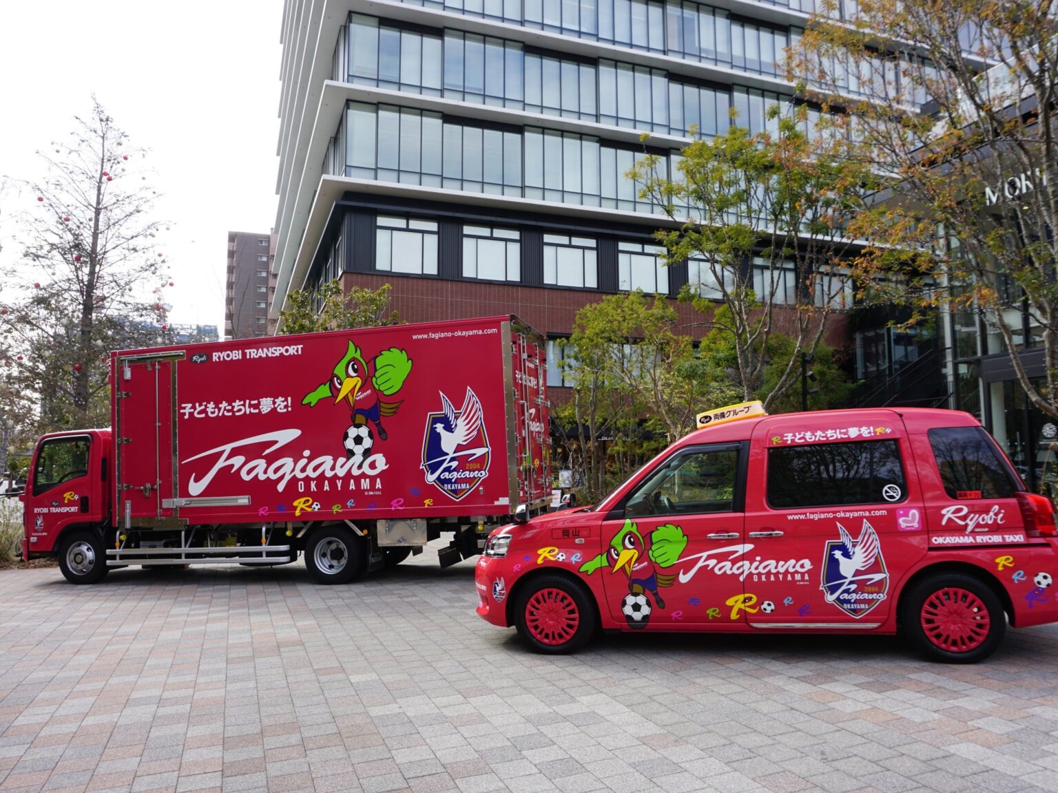 ファジアーノ岡山は2026シーズン開幕に合わせ、1月31日と2月1日の2日間、杜の街グレース(杜の街プラザ)で主催ポップアップストアを開きます。両備グループは初日のみ、ファジアーノ仕様のラッピング車両3台(バス・タクシー・トラック)を11時から16時まで展示します。