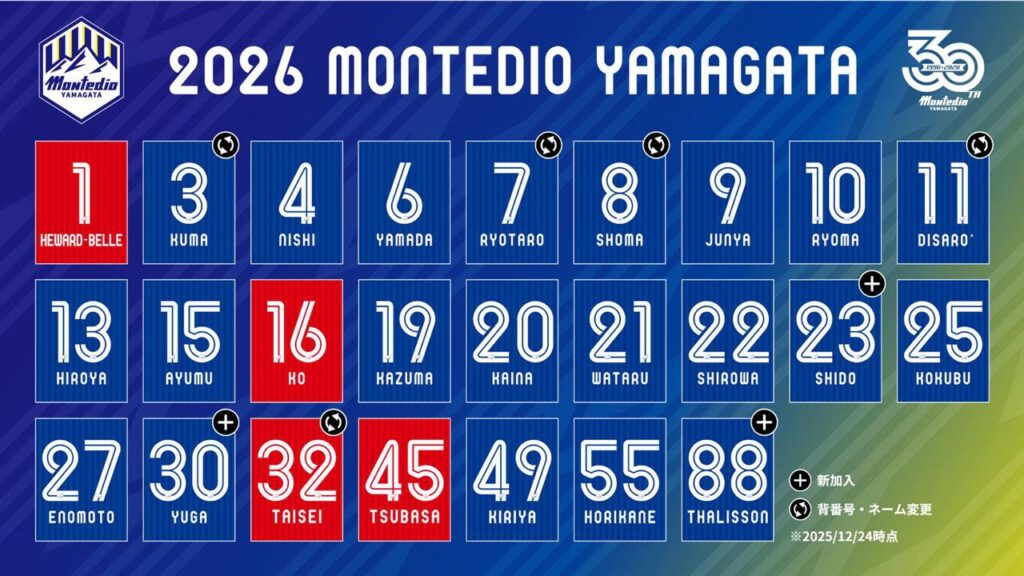 モンテディオ山形は2025年12月24日、トップチームの21選手と契約を更新し、来季に向けた背番号も決定したと発表しました。対象にはGKトーマス・ヒュワード=ベル(リーグ19試合)、MF土居聖真(リーグ34試合8得点)、FWディサロ燦シルヴァーノ(リーグ35試合11得点)らが含まれます。更新選手はGK2人、DF7人、MF8人、FW4人。今季の主力級では土居がリーグ34試合、國分伸太郎が36試合5得点、氣田亮真が32試合4得点、⾼橋潤哉が34試合7得点と稼働率の高い選手が残留します。クラブは「現時点で発表されている新加入選手を含め」背番号を確定させており、編成の骨格を早期に固めた形です。今後は未発表の補強や退団動向も含め、開幕までにチーム完成度をどこまで高められるかが焦点になります。